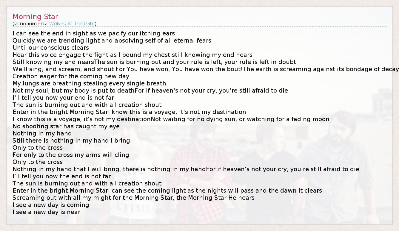 Enter in the bright Morning StarI can see the coming light as the nights will pass and the dawn it clears