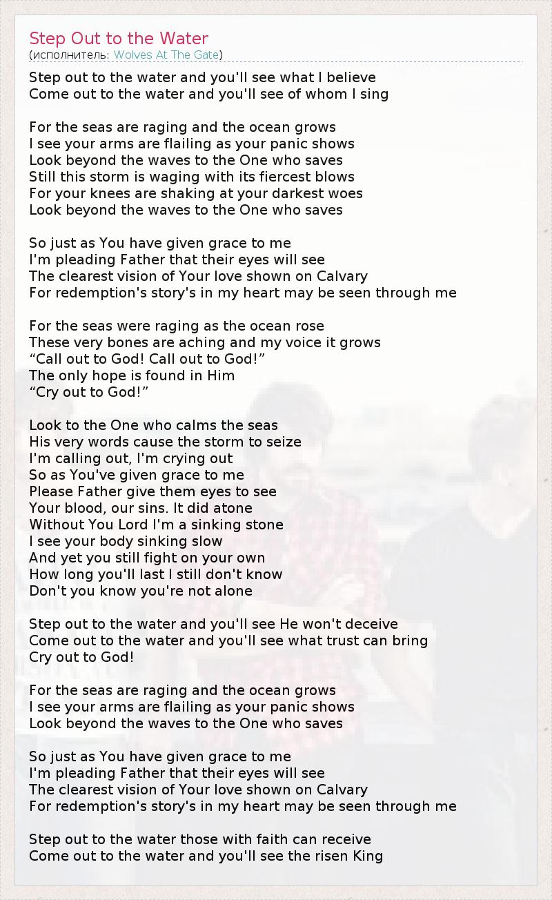 Выйдя на воду, и вы увидите, что я считаю, Выходите на воде , и вы увидите , о котором я пою Для морей бушуют и океан растет Я вижу ваши руки размахивая как ваши панических шоу Посмотрите за волнами к Тому, кто экономит Тем не менее эта буря ведет со своими яростных ударов Для колени трясутся в ваших темных беды Посмотрите за волнами к Тому, кто экономит Так же, как Вы дали благодать мне Я умолял Отца , что их глаза будут видеть Наиболее ярким видение любви Твоей показано на Голгофе Для история искупления в моем сердце можно увидеть через меня Для морей бушевали , как океан поднялся Именно эти кости болят и мой голос он растет " Позвоните к Богу ! Позвоните к Богу ! " Единственная надежда находится в Нем " Взывать к Богу ! " Посмотрите на Того, Кто успокаивает моря Очень Его слова вызывают шторм захватить Я звоню , я плачу из Так как Вы дали благодать мне Пожалуйста, Отец даст им глаза, чтобы видеть Ваша кровь , наши грехи . Это действительно искупить Без тебя Господа я тонущий камень Я вижу ваше тело погружается медленно И все же вы все еще борются по своему усмотрению Как долго вы будете длиться я все еще не знаю, Разве вы не знаете , вы не одиноки Выйдя к воде , и вы увидите Он не обманет Выходите на воде, и вы увидите, что доверие может принести Взывать к Богу ! Для морей бушуют и океан растет Я вижу ваши руки размахивая как ваши панических шоу Посмотрите за волнами к Тому, кто экономит Так же, как Вы дали благодать мне Я умолял Отца , что их глаза будут видеть Наиболее ярким видение любви Твоей показано на Голгофе Для история искупления в моем сердце можно увидеть через меня Выйдя к воде тех, с верой может получить Выходите на воде , и вы увидите воскресшего короля
