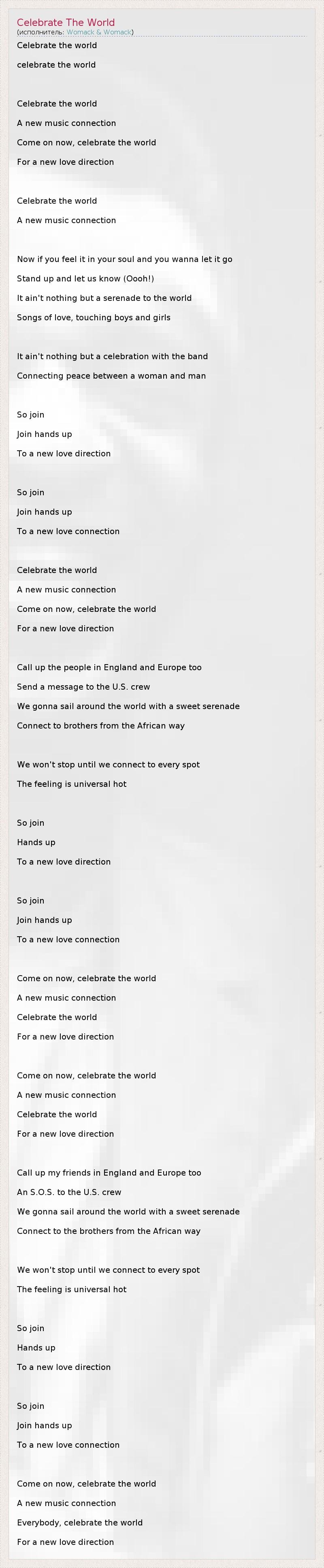 Celebrate the world celebrate the world Celebrate the world A new music connection Come on now, celebrate the world For a new love direction Celebrate the world A new music connection Now if you feel it in your soul and you wanna let it go Stand up and let us know (Oooh!) It ain't nothing but a serenade to the world Songs of love, touching boys and girls It ain't nothing but a celebration with the band Connecting peace between a woman and man So join Join hands up To a new love direction So join Join hands up To a new love connection Celebrate the world A new music connection Come on now, celebrate the world For a new love direction Call up the people in England and Europe too Send a message to the U.S. crew We gonna sail around the world with a sweet serenade Connect to brothers from the African way We won't stop until we connect to every spot The feeling is universal hot So join Hands up To a new love direction So join Join hands up To a new love connection Come on now, celebrate the world A new music connection Celebrate the world For a new love direction Come on now, celebrate the world A new music connection Celebrate the world For a new love direction Call up my friends in England and Europe too An S.O.S. to the U.S. crew We gonna sail around the world with a sweet serenade Connect to the brothers from the African way We won't stop until we connect to every spot The feeling is universal hot So join Hands up To a new love direction So join Join hands up To a new love connection Come on now, celebrate the world A new music connection Everybody, celebrate the world For a new love direction