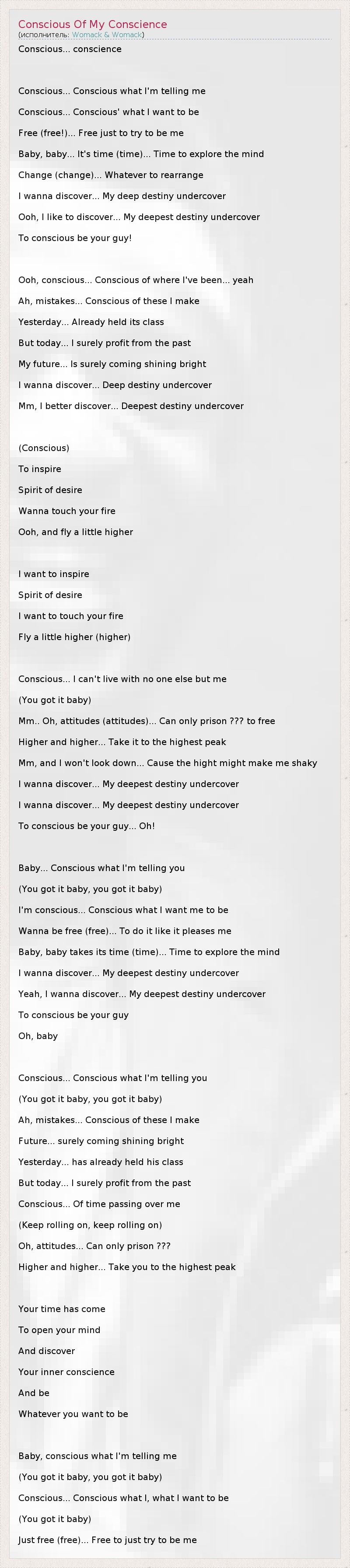 Conscious... conscience Conscious... Conscious what I'm telling me Conscious... Conscious' what I want to be Free (free!)... Free just to try to be me Baby, baby... It's time (time)... Time to explore the mind Change (change)... Whatever to rearrange I wanna discover... My deep destiny undercover Ooh, I like to discover... My deepest destiny undercover To conscious be your guy! Ooh, conscious... Conscious of where I've been... yeah Ah, mistakes... Conscious of these I make Yesterday... Already held its class But today... I surely profit from the past My future... Is surely coming shining bright I wanna discover... Deep destiny undercover Mm, I better discover... Deepest destiny undercover (Conscious) To inspire Spirit of desire Wanna touch your fire Ooh, and fly a little higher I want to inspire Spirit of desire I want to touch your fire Fly a little higher (higher) Conscious... I can't live with no one else but me (You got it baby) Mm.. Oh, attitudes (attitudes)... Can only prison ??? to free Higher and higher... Take it to the highest peak Mm, and I won't look down... Cause the hight might make me shaky I wanna discover... My deepest destiny undercover I wanna discover... My deepest destiny undercover To conscious be your guy... Oh! Baby... Conscious what I'm telling you (You got it baby, you got it baby) I'm conscious... Conscious what I want me to be Wanna be free (free)... To do it like it pleases me Baby, baby takes its time (time)... Time to explore the mind I wanna discover... My deepest destiny undercover Yeah, I wanna discover... My deepest destiny undercover To conscious be your guy Oh, baby Conscious... Conscious what I'm telling you (You got it baby, you got it baby) Ah, mistakes... Conscious of these I make Future... surely coming shining bright Yesterday... has already held his class But today... I surely profit from the past Conscious... Of time passing over me (Keep rolling on, keep rolling on) Oh, attitudes... Can only prison ??? Higher and higher... Take you to the highest peak Your time has come To open your mind And discover Your inner conscience And be Whatever you want to be Baby, conscious what I'm telling me (You got it baby, you got it baby) Conscious... Conscious what I, what I want to be (You got it baby) Just free (free)... Free to just try to be me