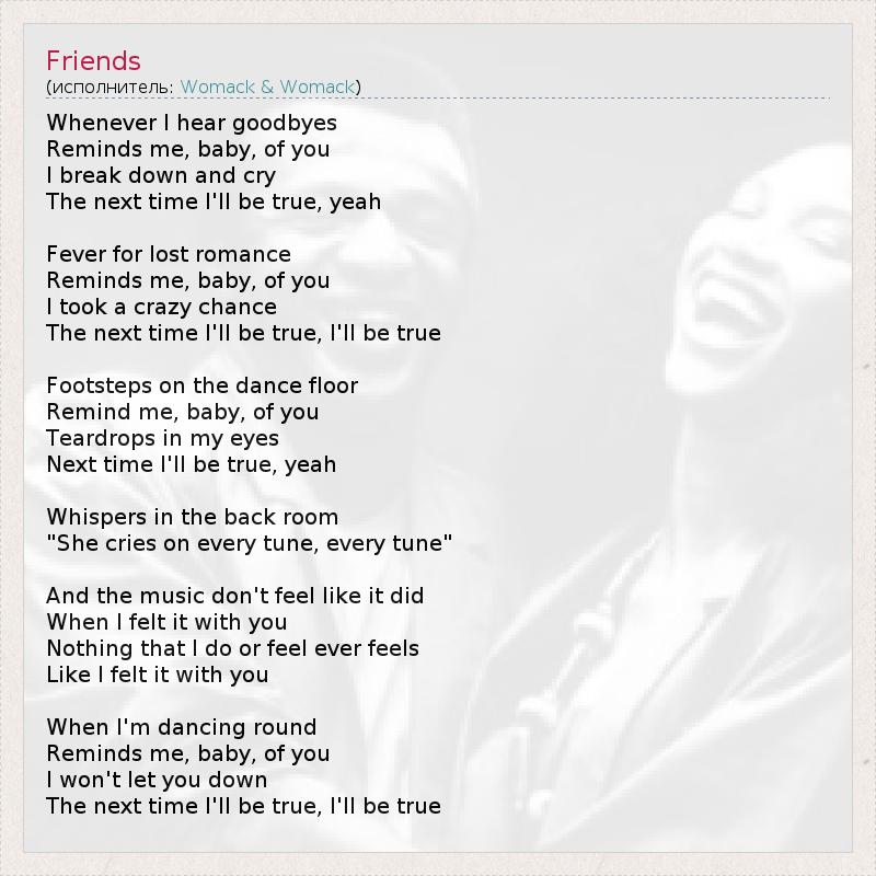 Каждое услышанное "прощай" Напоминает мне о тебе, детка. Мне становится грустно, и я плачу. Я больше не буду врать, нет. Жар от прошедшей любви Напоминает мне о тебе, детка. У меня был невероятный шанс, Я больше не буду врать, не буду врать. Звук шагов на танцполе Напоминают мне о тебе, детка. У меня слезы на глазах. Я больше не буду врать, нет. Шепот за спиной: "Она плачет от любого мотива, любого мотива". Но музыка не в силах передать того, Как я любил тебя, Никакие дела и чувства не скажут, Как я любил тебя. И когда я танцую, Я вспоминаю о тебе, детка. Я не обижу тебя, Впредь я не солгу, не солгу.