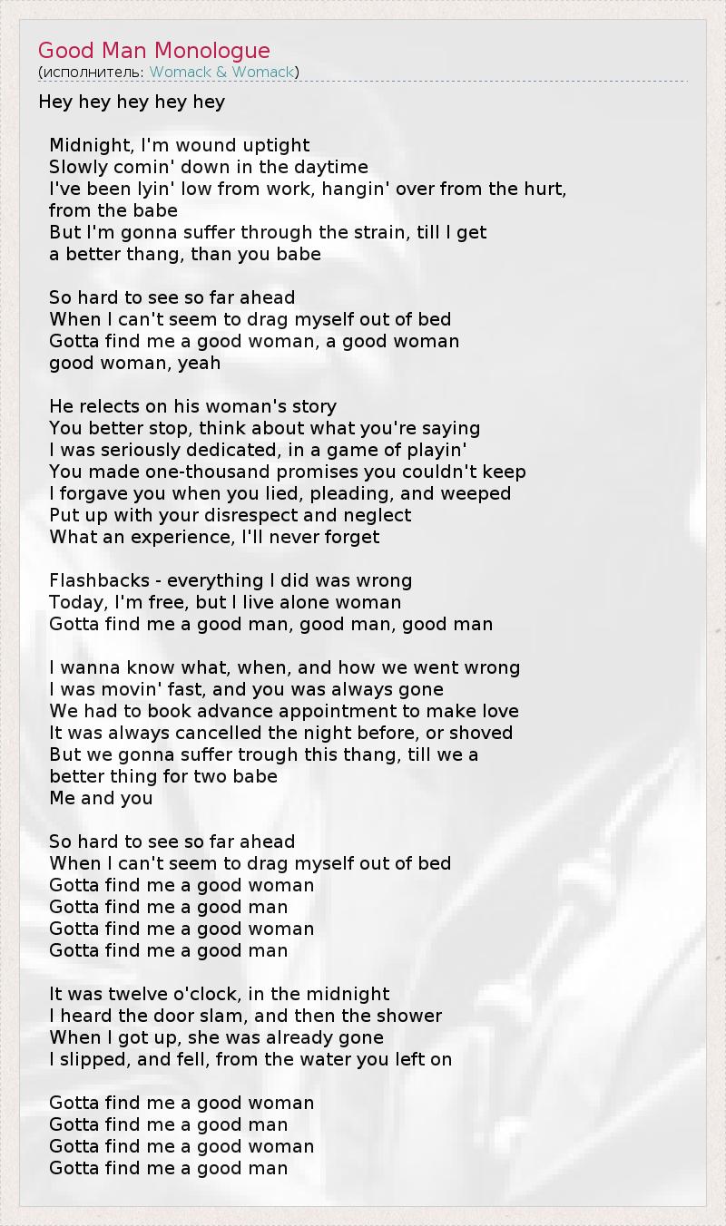 Hey hey hey hey hey Midnight, I'm wound uptight Slowly comin' down in the daytime I've been lyin' low from work, hangin' over from the hurt, from the babe But I'm gonna suffer through the strain, till I get a better thang, than you babe So hard to see so far ahead When I can't seem to drag myself out of bed Gotta find me a good woman, a good woman good woman, yeah He relects on his woman's story You better stop, think about what you're saying I was seriously dedicated, in a game of playin' You made one-thousand promises you couldn't keep I forgave you when you lied, pleading, and weeped Put up with your disrespect and neglect What an experience, I'll never forget Flashbacks - everything I did was wrong Today, I'm free, but I live alone woman Gotta find me a good man, good man, good man I wanna know what, when, and how we went wrong I was movin' fast, and you was always gone We had to book advance appointment to make love It was always cancelled the night before, or shoved But we gonna suffer trough this thang, till we a better thing for two babe Me and you So hard to see so far ahead When I can't seem to drag myself out of bed Gotta find me a good woman Gotta find me a good man Gotta find me a good woman Gotta find me a good man It was twelve o'clock, in the midnight I heard the door slam, and then the shower When I got up, she was already gone I slipped, and fell, from the water you left on Gotta find me a good woman Gotta find me a good man Gotta find me a good woman Gotta find me a good man