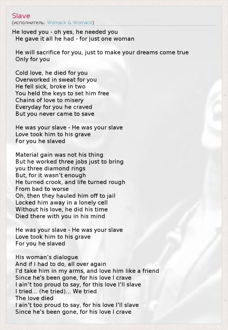 He loved you - oh yes, he needed you He gave it all he had - for just one woman He will sacrifice for you, just to make your dreams come true Only for you Cold love, he died for you Overworked in sweat for you He fell sick, broke in two You held the keys to set him free Chains of love to misery Everyday for you he craved But you never came to save He was your slave - He was your slave Love took him to his grave For you he slaved Material gain was not his thing But he worked three jobs just to bring you three diamond rings But, for it wasn't enough He turned crook, and life turned rough From bad to worse Oh, then they hauled him off to jail Locked him away in a lonely cell Without his love, he did his time Died there with you in his mind He was your slave - He was your slave Love took him to his grave For you he slaved His woman's dialogue And if I had to do, all over again I'd take him in my arms, and love him like a friend Since he's been gone, for his love I crave I ain't too proud to say, for this love I'll slave I tried... (he tried)... We tried The love died I ain't too proud to say, for his love I'll slave Since he's been gone, for his love I crave