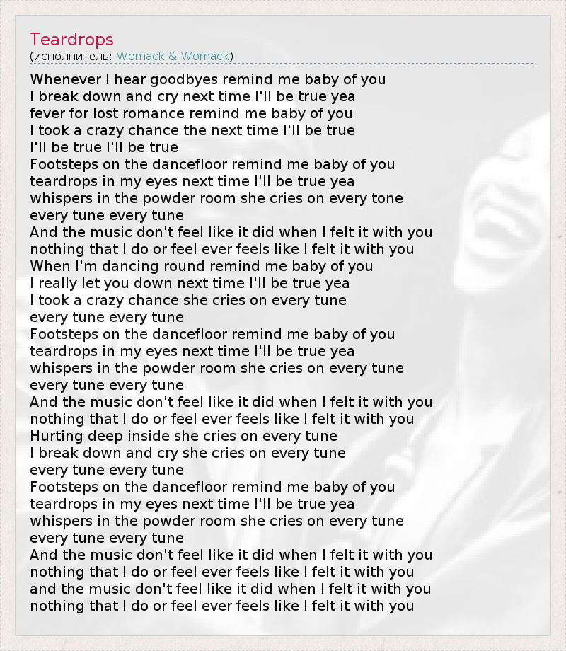 Whenever I hear goodbyes remind me baby of you I break down and cry next time I'll be true yea fever for lost romance remind me baby of you I took a crazy chance the next time I'll be true I'll be true I'll be true Footsteps on the dancefloor remind me baby of you teardrops in my eyes next time I'll be true yea whispers in the powder room she cries on every tone every tune every tune And the music don't feel like it did when I felt it with you nothing that I do or feel ever feels like I felt it with you When I'm dancing round remind me baby of you I really let you down next time I'll be true yea I took a crazy chance she cries on every tune every tune every tune Footsteps on the dancefloor remind me baby of you teardrops in my eyes next time I'll be true yea whispers in the powder room she cries on every tune every tune every tune And the music don't feel like it did when I felt it with you nothing that I do or feel ever feels like I felt it with you Hurting deep inside she cries on every tune I break down and cry she cries on every tune every tune every tune Footsteps on the dancefloor remind me baby of you teardrops in my eyes next time I'll be true yea whispers in the powder room she cries on every tune every tune every tune And the music don't feel like it did when I felt it with you nothing that I do or feel ever feels like I felt it with you and the music don't feel like it did when I felt it with you nothing that I do or feel ever feels like I felt it with you
