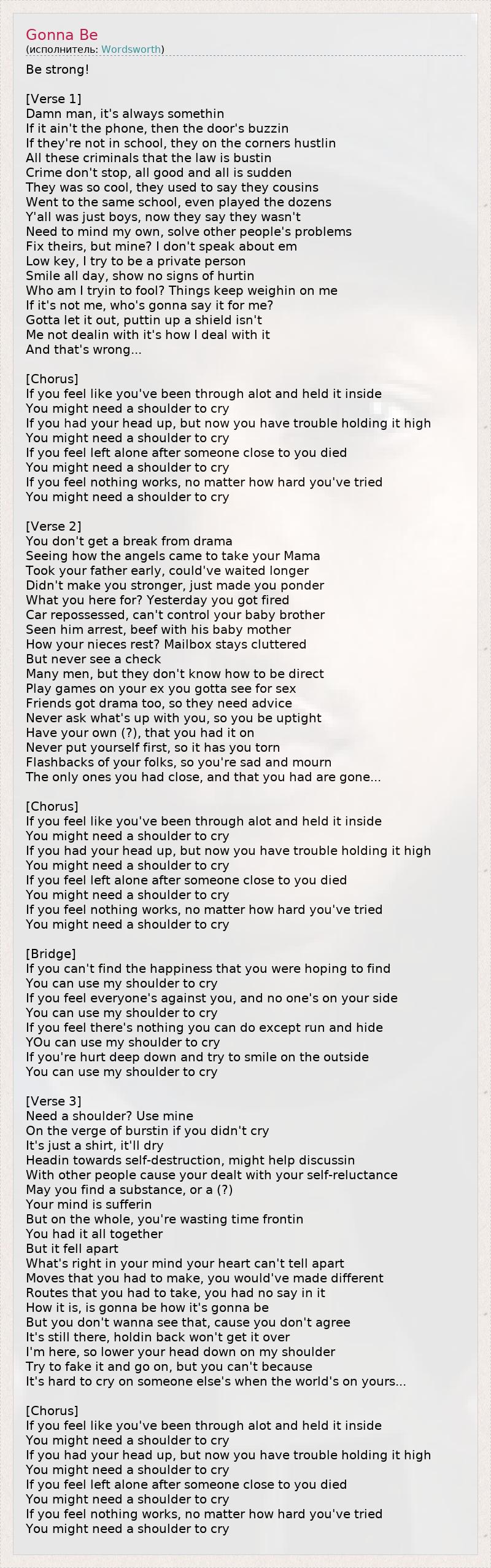 Be strong! [Verse 1] Damn man, it's always somethin If it ain't the phone, then the door's buzzin If they're not in school, they on the corners hustlin All these criminals that the law is bustin Crime don't stop, all good and all is sudden They was so cool, they used to say they cousins Went to the same school, even played the dozens Y'all was just boys, now they say they wasn't Need to mind my own, solve other people's problems Fix theirs, but mine? I don't speak about em Low key, I try to be a private person Smile all day, show no signs of hurtin Who am I tryin to fool? Things keep weighin on me If it's not me, who's gonna say it for me? Gotta let it out, puttin up a shield isn't Me not dealin with it's how I deal with it And that's wrong... [Chorus] If you feel like you've been through alot and held it inside You might need a shoulder to cry If you had your head up, but now you have trouble holding it high You might need a shoulder to cry If you feel left alone after someone close to you died You might need a shoulder to cry If you feel nothing works, no matter how hard you've tried You might need a shoulder to cry [Verse 2] You don't get a break from drama Seeing how the angels came to take your Mama Took your father early, could've waited longer Didn't make you stronger, just made you ponder What you here for? Yesterday you got fired Car repossessed, can't control your baby brother Seen him arrest, beef with his baby mother How your nieces rest? Mailbox stays cluttered But never see a check Many men, but they don't know how to be direct Play games on your ex you gotta see for sex Friends got drama too, so they need advice Never ask what's up with you, so you be uptight Have your own (?), that you had it on Never put yourself first, so it has you torn Flashbacks of your folks, so you're sad and mourn The only ones you had close, and that you had are gone... [Chorus] If you feel like you've been through alot and held it inside You might need a shoulder to cry If you had your head up, but now you have trouble holding it high You might need a shoulder to cry If you feel left alone after someone close to you died You might need a shoulder to cry If you feel nothing works, no matter how hard you've tried You might need a shoulder to cry [Bridge] If you can't find the happiness that you were hoping to find You can use my shoulder to cry If you feel everyone's against you, and no one's on your side You can use my shoulder to cry If you feel there's nothing you can do except run and hide YOu can use my shoulder to cry If you're hurt deep down and try to smile on the outside You can use my shoulder to cry [Verse 3] Need a shoulder? Use mine On the verge of burstin if you didn't cry It's just a shirt, it'll dry Headin towards self-destruction, might help discussin With other people cause your dealt with your self-reluctance May you find a substance, or a (?) Your mind is sufferin But on the whole, you're wasting time frontin You had it all together But it fell apart What's right in your mind your heart can't tell apart Moves that you had to make, you would've made different Routes that you had to take, you had no say in it How it is, is gonna be how it's gonna be But you don't wanna see that, cause you don't agree It's still there, holdin back won't get it over I'm here, so lower your head down on my shoulder Try to fake it and go on, but you can't because It's hard to cry on someone else's when the world's on yours... [Chorus] If you feel like you've been through alot and held it inside You might need a shoulder to cry If you had your head up, but now you have trouble holding it high You might need a shoulder to cry If you feel left alone after someone close to you died You might need a shoulder to cry If you feel nothing works, no matter how hard you've tried You might need a shoulder to cry