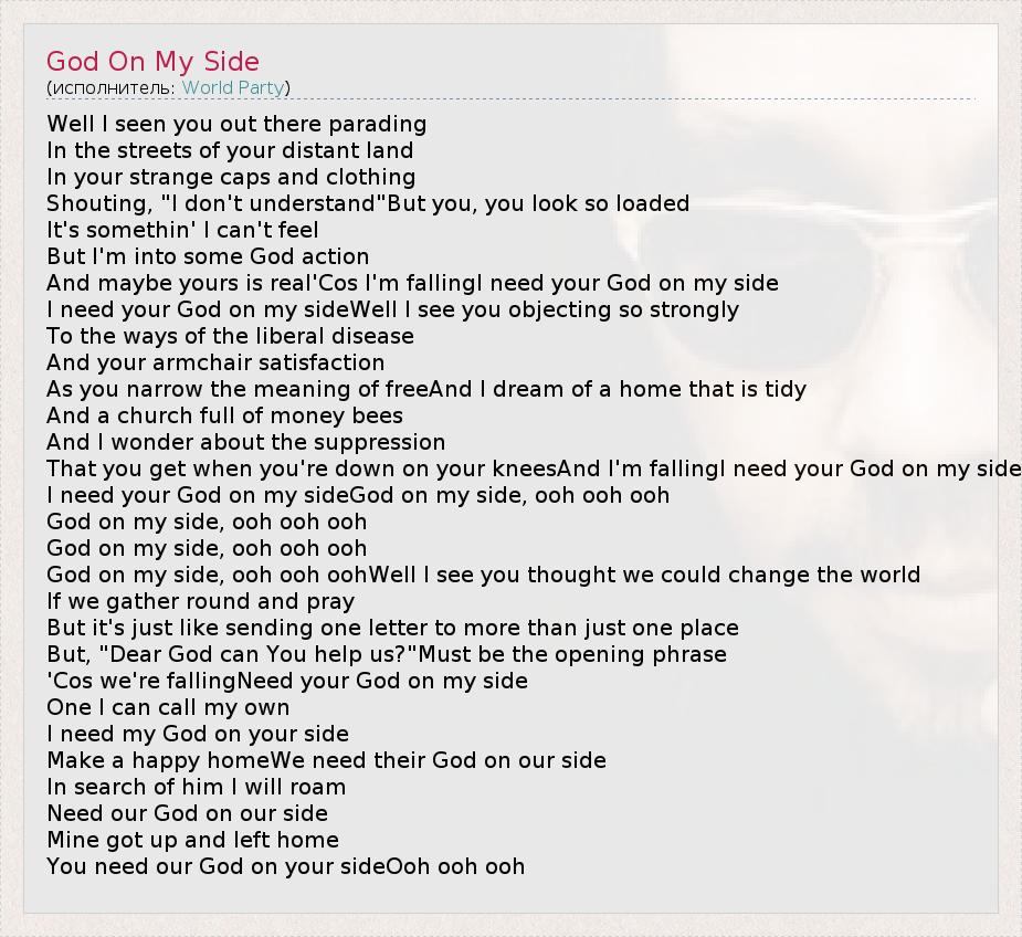Well I seen you out there parading In the streets of your distant land In your strange caps and clothing Shouting, "I don't understand"But you, you look so loaded It's somethin' I can't feel But I'm into some God action And maybe yours is real'Cos I'm fallingI need your God on my side I need your God on my sideWell I see you objecting so strongly To the ways of the liberal disease And your armchair satisfaction As you narrow the meaning of freeAnd I dream of a home that is tidy And a church full of money bees And I wonder about the suppression That you get when you're down on your kneesAnd I'm fallingI need your God on my side I need your God on my sideGod on my side, ooh ooh ooh God on my side, ooh ooh ooh God on my side, ooh ooh ooh God on my side, ooh ooh oohWell I see you thought we could change the world If we gather round and pray But it's just like sending one letter to more than just one place But, "Dear God can You help us?"Must be the opening phrase 'Cos we're fallingNeed your God on my side One I can call my own I need my God on your side Make a happy homeWe need their God on our side In search of him I will roam Need our God on our side Mine got up and left home You need our God on your sideOoh ooh ooh