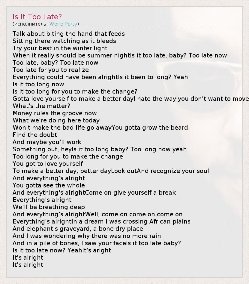 А как ты думаешь, о чем песня "Is It Too Late?" ?