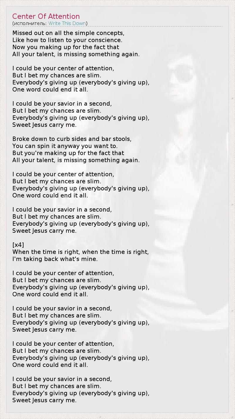 Missed out on all the simple concepts, Like how to listen to your conscience. Now you making up for the fact that All your talent, is missing something again. I could be your center of attention, But I bet my chances are slim. Everybody's giving up (everybody's giving up), One word could end it all. I could be your savior in a second, But I bet my chances are slim. Everybody's giving up (everybody's giving up), Sweet Jesus carry me. Broke down to curb sides and bar stools, You can spin it anyway you want to. But you're making up for the fact that All your talent, is missing something again. I could be your center of attention, But I bet my chances are slim. Everybody's giving up (everybody's giving up), One word could end it all. I could be your savior in a second, But I bet my chances are slim. Everybody's giving up (everybody's giving up), Sweet Jesus carry me. [x4] When the time is right, when the time is right, I'm taking back what's mine. I could be your center of attention, But I bet my chances are slim. Everybody's giving up (everybody's giving up), One word could end it all. I could be your savior in a second, But I bet my chances are slim. Everybody's giving up (everybody's giving up), Sweet Jesus carry me. I could be your center of attention, But I bet my chances are slim. Everybody's giving up (everybody's giving up), One word could end it all. I could be your savior in a second, But I bet my chances are slim. Everybody's giving up (everybody's giving up), Sweet Jesus carry me.