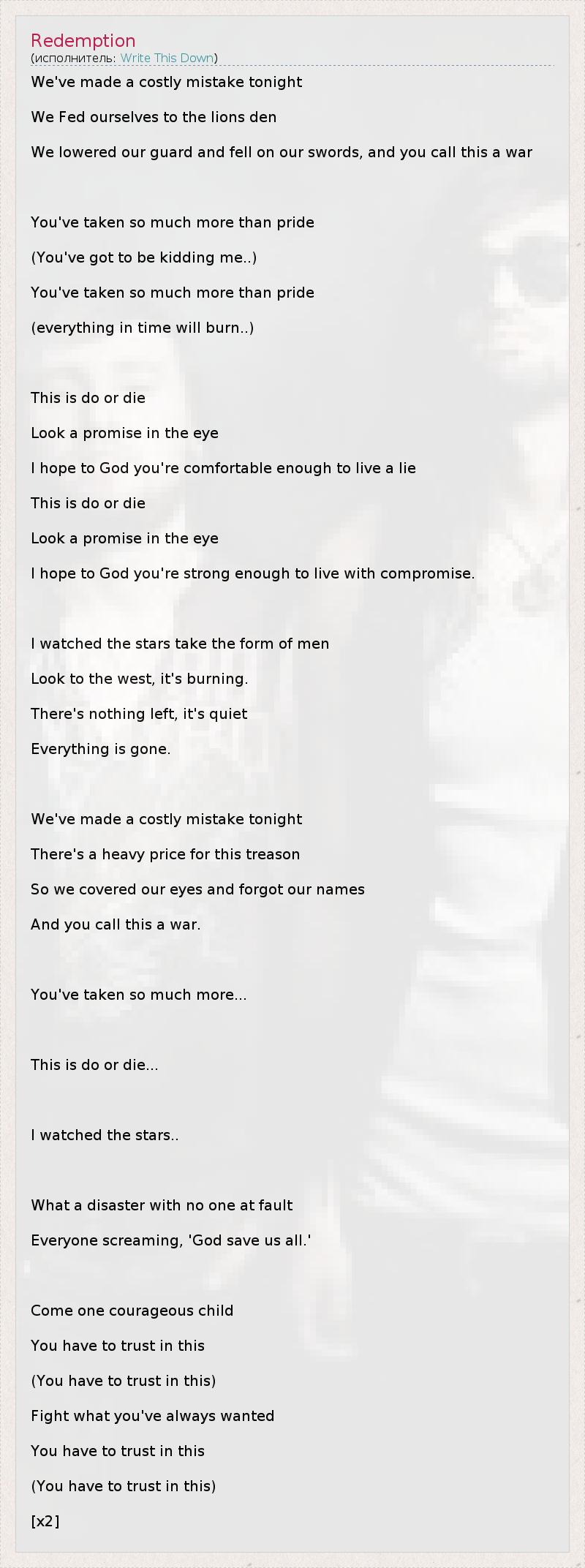Это интересно:Write This Down - американская христианская рок-группа из Миннеаполиса, штат Миннесота. Сформированная в 2005 году группа состоит из вокалиста Джонни Кулиера, гитариста Майка Кувича, ритм-гитарист и вокалиста Нэйта Роквелла, басиста Ника Ломбардо, и барабанщика Чада Николса. Их музыку крутили на интернет-радиостанциях, они получали регулярную ротацию на RadioU и ChristianRock.Net. 10 мая 2010 года... продолжение