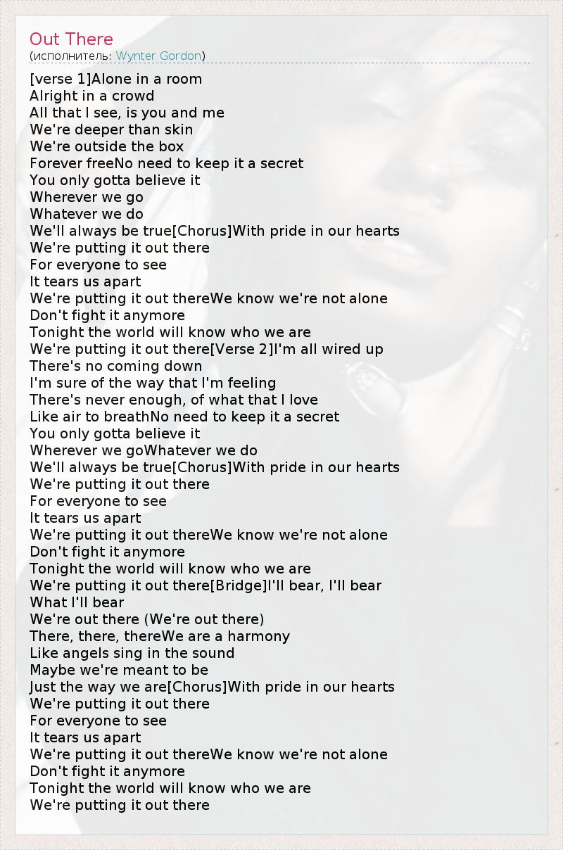 [verse 1]Alone in a room Alright in a crowd All that I see, is you and me We're deeper than skin We're outside the box Forever freeNo need to keep it a secret You only gotta believe it Wherever we go Whatever we do We'll always be true[Chorus]With pride in our hearts We're putting it out there For everyone to see It tears us apart We're putting it out thereWe know we're not alone Don't fight it anymore Tonight the world will know who we are We're putting it out there[Verse 2]I'm all wired up There's no coming down I'm sure of the way that I'm feeling There's never enough, of what that I love Like air to breathNo need to keep it a secret You only gotta believe it Wherever we goWhatever we do We'll always be true[Chorus]With pride in our hearts We're putting it out there For everyone to see It tears us apart We're putting it out thereWe know we're not alone Don't fight it anymore Tonight the world will know who we are We're putting it out there[Bridge]I'll bear, I'll bear What I'll bear We're out there (We're out there) There, there, thereWe are a harmony Like angels sing in the sound Maybe we're meant to be Just the way we are[Chorus]With pride in our hearts We're putting it out there For everyone to see It tears us apart We're putting it out thereWe know we're not alone Don't fight it anymore Tonight the world will know who we are We're putting it out there
