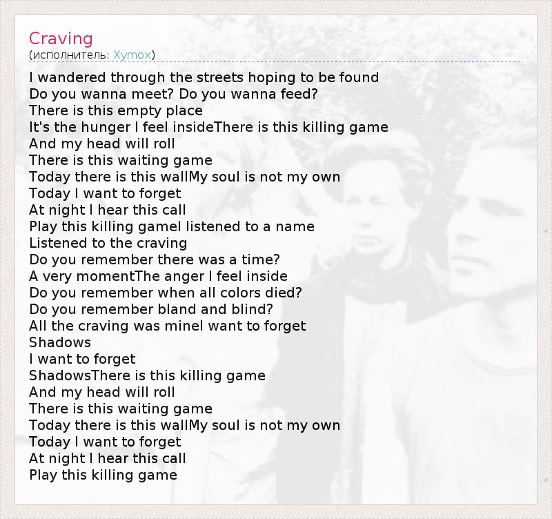 I wandered through the streets hoping to be found Do you wanna meet? Do you wanna feed? There is this empty place It's the hunger I feel insideThere is this killing game And my head will roll There is this waiting game Today there is this wallMy soul is not my own Today I want to forget At night I hear this call Play this killing gameI listened to a name Listened to the craving Do you remember there was a time? A very momentThe anger I feel inside Do you remember when all colors died? Do you remember bland and blind? All the craving was mineI want to forget Shadows I want to forget ShadowsThere is this killing game And my head will roll There is this waiting game Today there is this wallMy soul is not my own Today I want to forget At night I hear this call Play this killing game