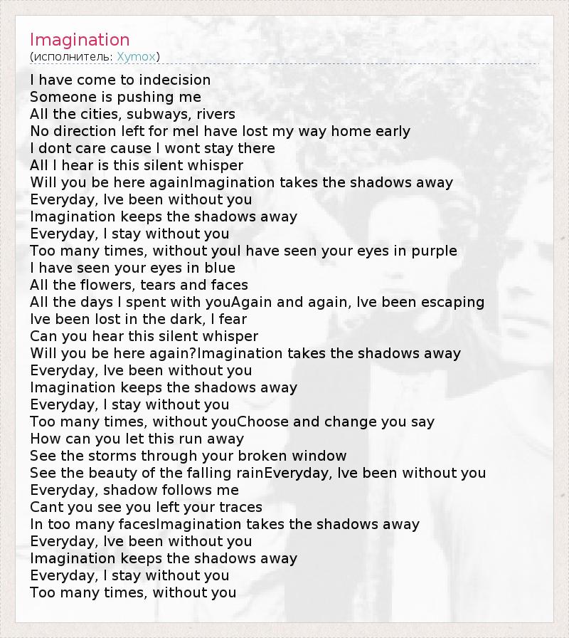 I have come to indecision Someone is pushing me All the cities, subways, rivers No direction left for meI have lost my way home early I dont care cause I wont stay there All I hear is this silent whisper Will you be here againImagination takes the shadows away Everyday, Ive been without you Imagination keeps the shadows away Everyday, I stay without you Too many times, without youI have seen your eyes in purple I have seen your eyes in blue All the flowers, tears and faces All the days I spent with youAgain and again, Ive been escaping Ive been lost in the dark, I fear Can you hear this silent whisper Will you be here again?Imagination takes the shadows away Everyday, Ive been without you Imagination keeps the shadows away Everyday, I stay without you Too many times, without youChoose and change you say How can you let this run away See the storms through your broken window See the beauty of the falling rainEveryday, Ive been without you Everyday, shadow follows me Cant you see you left your traces In too many facesImagination takes the shadows away Everyday, Ive been without you Imagination keeps the shadows away Everyday, I stay without you Too many times, without you
