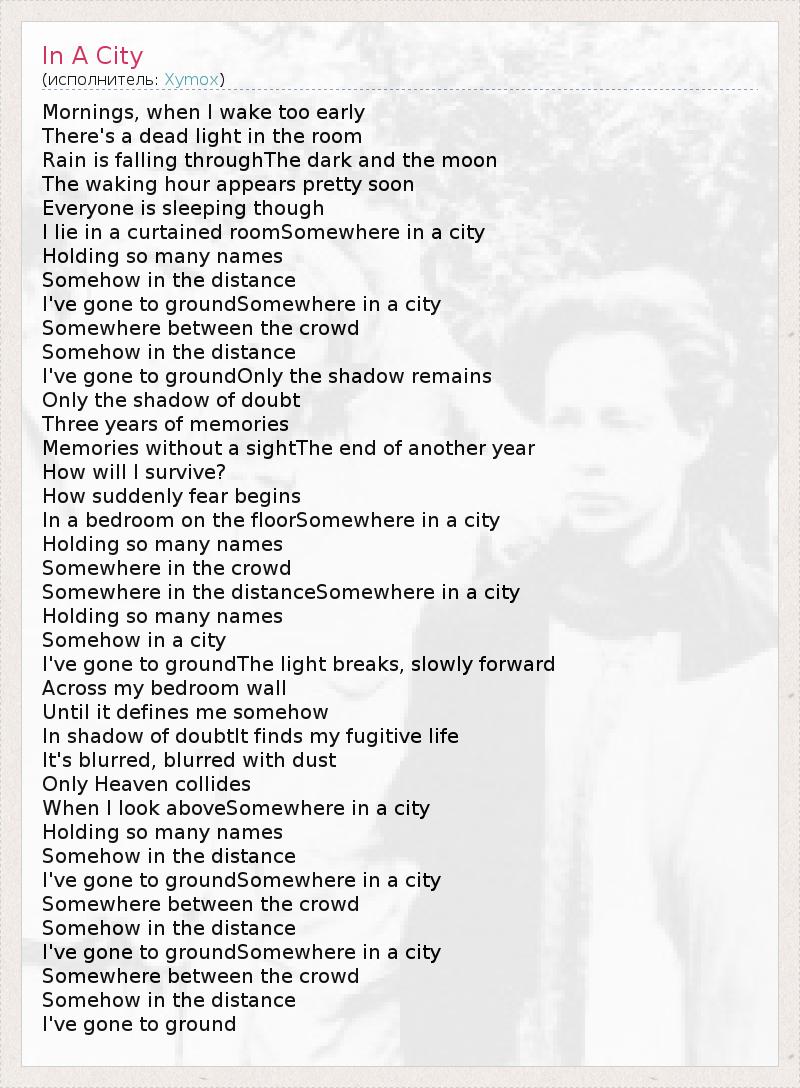 Mornings, when I wake too early There's a dead light in the room Rain is falling throughThe dark and the moon The waking hour appears pretty soon Everyone is sleeping though I lie in a curtained roomSomewhere in a city Holding so many names Somehow in the distance I've gone to groundSomewhere in a city Somewhere between the crowd Somehow in the distance I've gone to groundOnly the shadow remains Only the shadow of doubt Three years of memories Memories without a sightThe end of another year How will I survive? How suddenly fear begins In a bedroom on the floorSomewhere in a city Holding so many names Somewhere in the crowd Somewhere in the distanceSomewhere in a city Holding so many names Somehow in a city I've gone to groundThe light breaks, slowly forward Across my bedroom wall Until it defines me somehow In shadow of doubtIt finds my fugitive life It's blurred, blurred with dust Only Heaven collides When I look aboveSomewhere in a city Holding so many names Somehow in the distance I've gone to groundSomewhere in a city Somewhere between the crowd Somehow in the distance I've gone to groundSomewhere in a city Somewhere between the crowd Somehow in the distance I've gone to ground