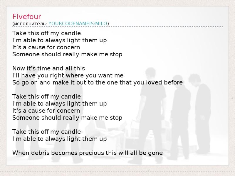 Take this off my candle I'm able to always light them up It's a cause for concern Someone should really make me stop Now it's time and all this I'll have you right where you want me So go on and make it out to the one that you loved before Take this off my candle I'm able to always light them up It's a cause for concern Someone should really make me stop Take this off my candle I'm able to always light them up When debris becomes precious this will all be gone