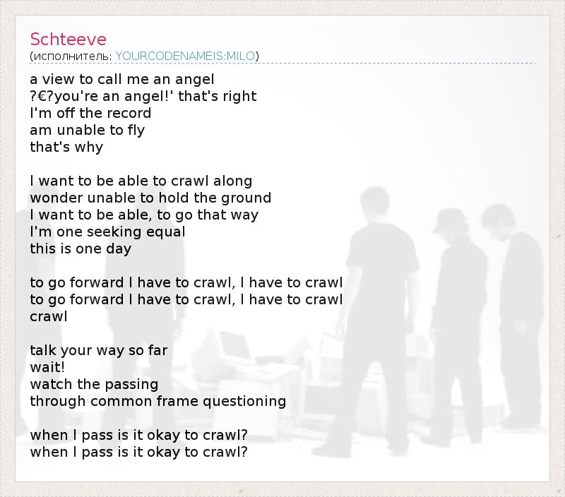 a view to call me an angel ?€?you're an angel!' that's right I'm off the record am unable to fly that's why I want to be able to crawl along wonder unable to hold the ground I want to be able, to go that way I'm one seeking equal this is one day to go forward I have to crawl, I have to crawl to go forward I have to crawl, I have to crawl crawl talk your way so far wait! watch the passing through common frame questioning when I pass is it okay to crawl? when I pass is it okay to crawl?