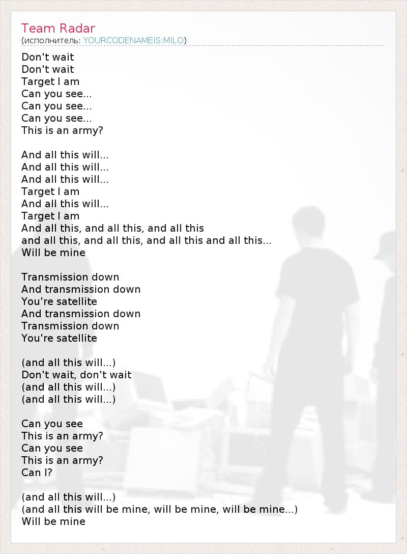 Don't wait Don't wait Target I am Can you see... Can you see... Can you see... This is an army? And all this will... And all this will... And all this will... Target I am And all this will... Target I am And all this, and all this, and all this and all this, and all this, and all this and all this... Will be mine Transmission down And transmission down You're satellite And transmission down Transmission down You're satellite (and all this will...) Don't wait, don't wait (and all this will...) (and all this will...) Can you see This is an army? Can you see This is an army? Can I? (and all this will...) (and all this will be mine, will be mine, will be mine...) Will be mine