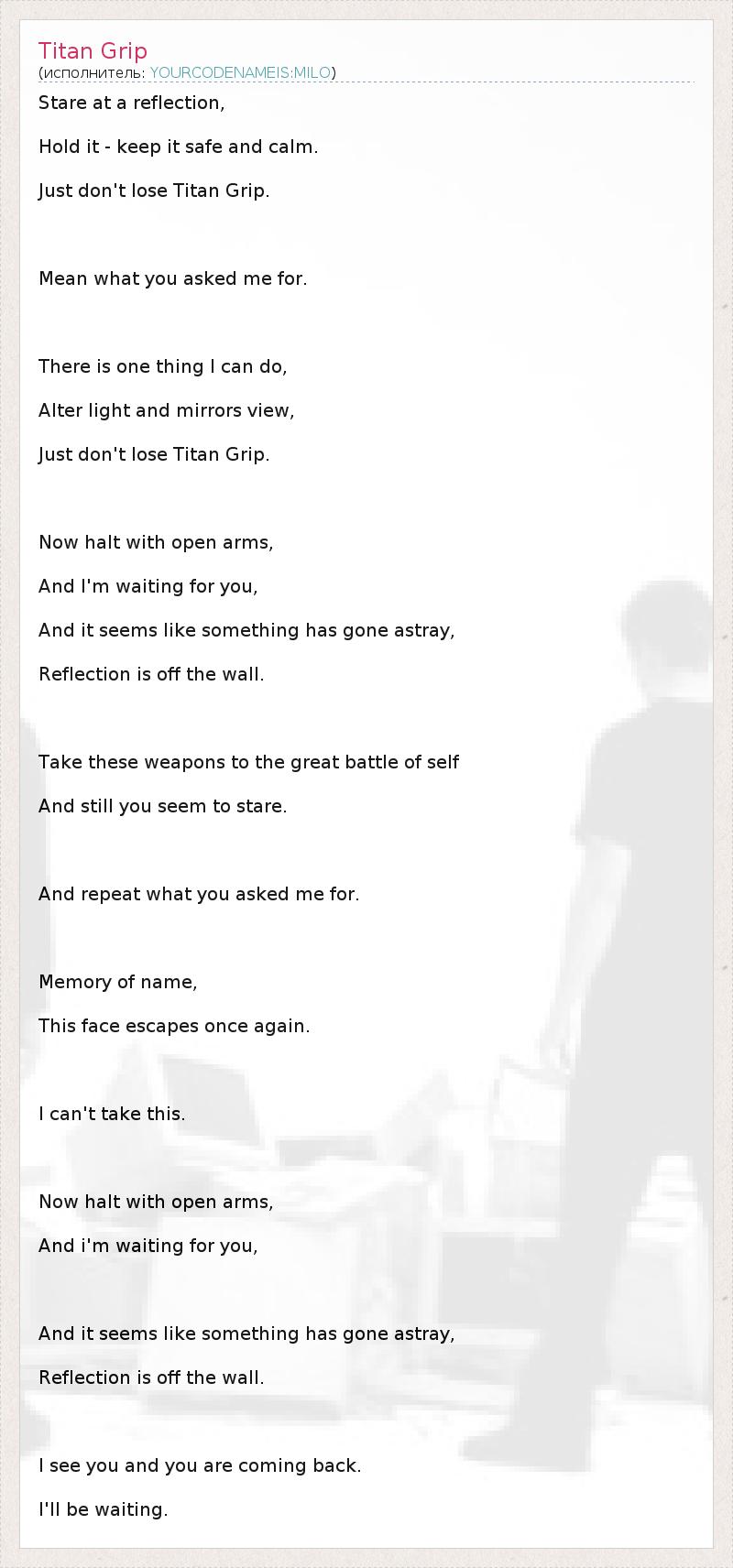 Stare at a reflection, Hold it - keep it safe and calm. Just don't lose Titan Grip. Mean what you asked me for. There is one thing I can do, Alter light and mirrors view, Just don't lose Titan Grip. Now halt with open arms, And I'm waiting for you, And it seems like something has gone astray, Reflection is off the wall. Take these weapons to the great battle of self And still you seem to stare. And repeat what you asked me for. Memory of name, This face escapes once again. I can't take this. Now halt with open arms, And i'm waiting for you, And it seems like something has gone astray, Reflection is off the wall. I see you and you are coming back. I'll be waiting.