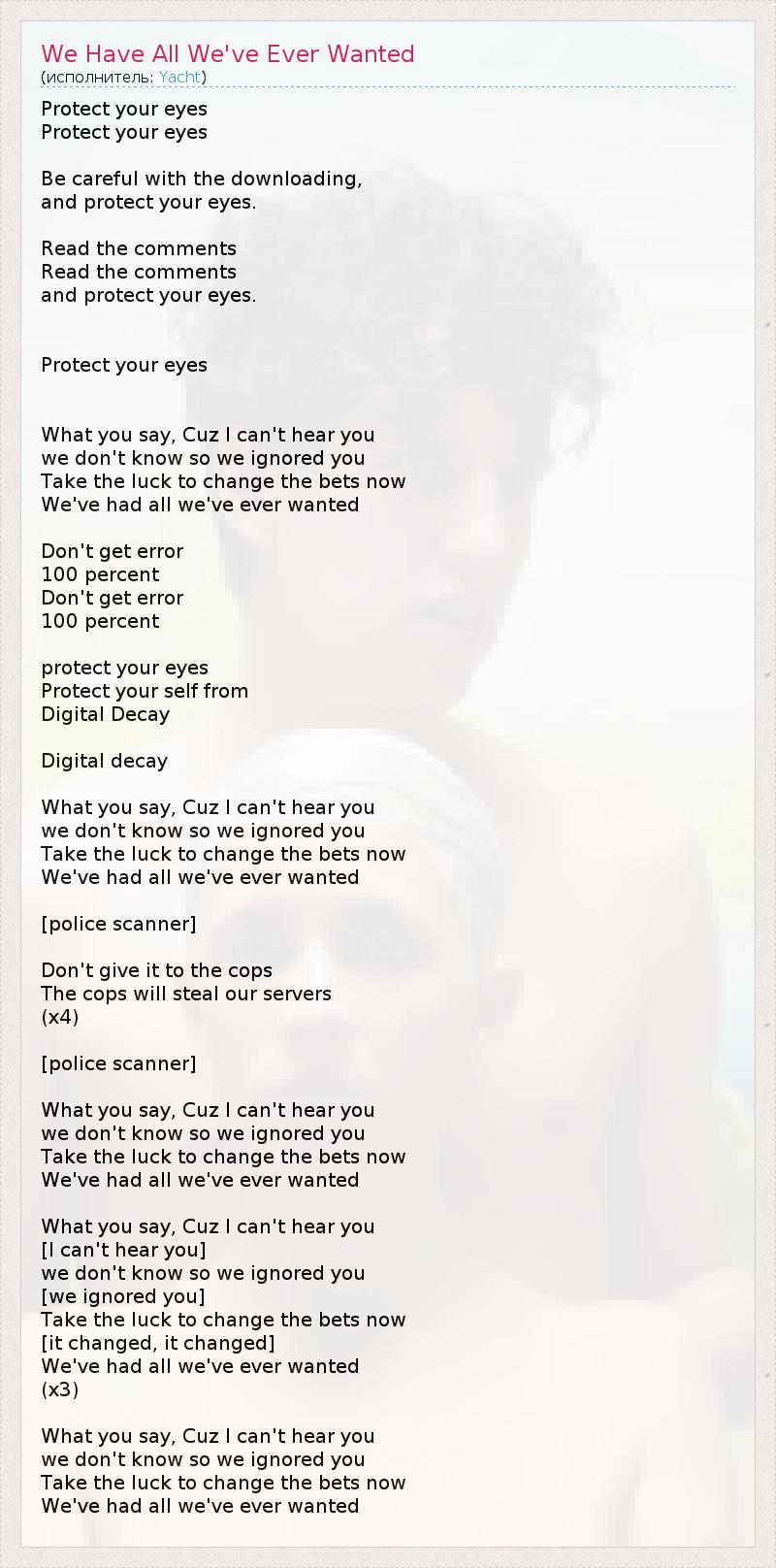 ГлавнаяИсполнителиYachtWe Have All We've Ever Wanted
