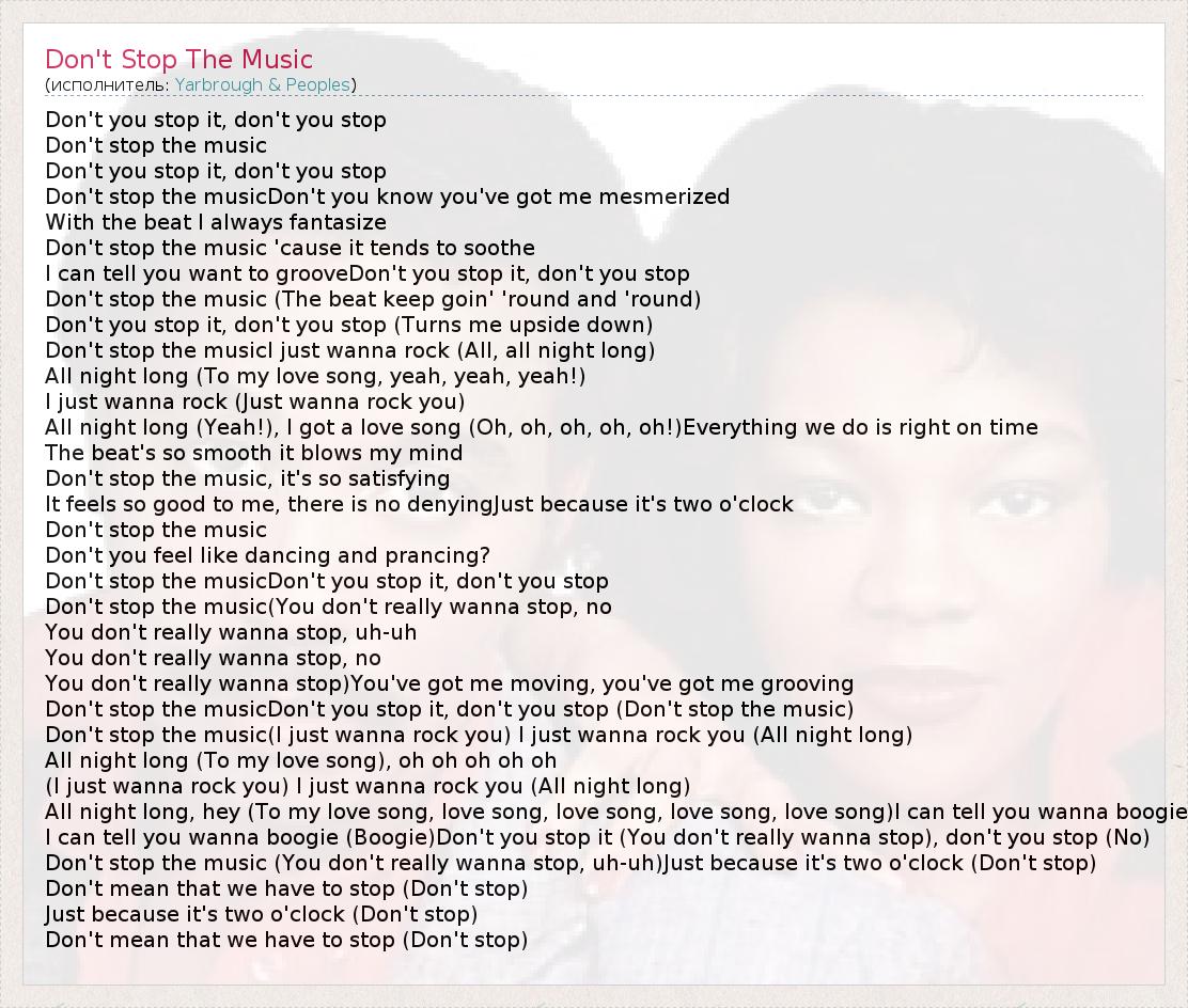 Don't you stop it, don't you stop Don't stop the music Don't you stop it, don't you stop Don't stop the musicDon't you know you've got me mesmerized With the beat I always fantasize Don't stop the music 'cause it tends to soothe I can tell you want to grooveDon't you stop it, don't you stop Don't stop the music (The beat keep goin' 'round and 'round) Don't you stop it, don't you stop (Turns me upside down) Don't stop the musicI just wanna rock (All, all night long) All night long (To my love song, yeah, yeah, yeah!) I just wanna rock (Just wanna rock you) All night long (Yeah!), I got a love song (Oh, oh, oh, oh, oh!)Everything we do is right on time The beat's so smooth it blows my mind Don't stop the music, it's so satisfying It feels so good to me, there is no denyingJust because it's two o'clock Don't stop the music Don't you feel like dancing and prancing? Don't stop the musicDon't you stop it, don't you stop Don't stop the music(You don't really wanna stop, no You don't really wanna stop, uh-uh You don't really wanna stop, no You don't really wanna stop)You've got me moving, you've got me grooving Don't stop the musicDon't you stop it, don't you stop (Don't stop the music) Don't stop the music(I just wanna rock you) I just wanna rock you (All night long) All night long (To my love song), oh oh oh oh oh (I just wanna rock you) I just wanna rock you (All night long) All night long, hey (To my love song, love song, love song, love song, love song)I can tell you wanna boogie I can tell you wanna boogie (Boogie)Don't you stop it (You don't really wanna stop), don't you stop (No) Don't stop the music (You don't really wanna stop, uh-uh)Just because it's two o'clock (Don't stop) Don't mean that we have to stop (Don't stop) Just because it's two o'clock (Don't stop) Don't mean that we have to stop (Don't stop)