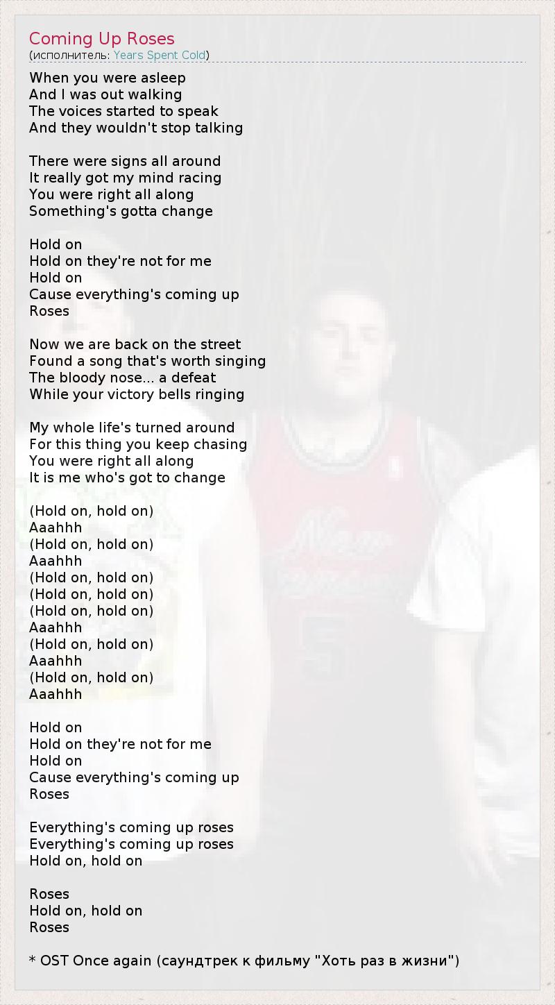 When you were asleep And I was out walking The voices started to speak And they wouldn't stop talking There were signs all around It really got my mind racing You were right all along Something's gotta change Hold on Hold on they're not for me Hold on Cause everything's coming up Roses Now we are back on the street Found a song that's worth singing The bloody nose... a defeat While your victory bells ringing My whole life's turned around For this thing you keep chasing You were right all along It is me who's got to change (Hold on, hold on) Aaahhh (Hold on, hold on) Aaahhh (Hold on, hold on) (Hold on, hold on) (Hold on, hold on) Aaahhh (Hold on, hold on) Aaahhh (Hold on, hold on) Aaahhh Hold on Hold on they're not for me Hold on Cause everything's coming up Roses Everything's coming up roses Everything's coming up roses Hold on, hold on Roses Hold on, hold on Roses * OST Once again (саундтрек к фильму "Хоть раз в жизни")
