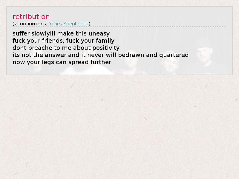 Это интересно:В то время как делать себе имя на современной метал-сцене США означает окружить себя группами передрачивающими шведский МДМ в диком экстазе и мажущими свои глаза черной тушью, натянув перед этим пару дамских трусов, Years Spent Cold избрали свое виденье их будущего стиля, как нечто дикое и первородное, соединив в своей музыке мощь и напор хардкора новой школы и техничного, но брутального дэт-метала…... продолжение