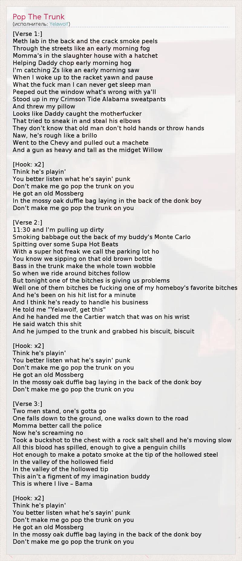 3 – Выражение pop the trunk (дословно: "открыть багажник") в южных штатах Америки подразумевает угрозу (так как в багажнике может лежать бейсбольная бита, ружьё или другое оружие) и употребляется в конструкциях, родственных по смыслу фразеологизму "лезть на рожон".