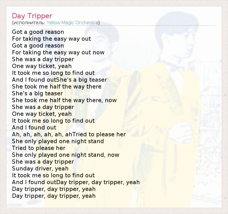 Got a good reason For taking the easy way out Got a good reason For taking the easy way out now She was a day tripper One way ticket, yeah It took me so long to find out And I found outShe's a big teaser She took me half the way there She's a big teaser She took me half the way there, now She was a day tripper One way ticket, yeah It took me so long to find out And I found out Ah, ah, ah, ah, ah, ahTried to please her She only played one night stand Tried to please her She only played one night stand, now She was a day tripper Sunday driver, yeah It took me so long to find out And I found outDay tripper, day tripper, yeah Day tripper, day tripper, yeah Day tripper, day tripper, yeah