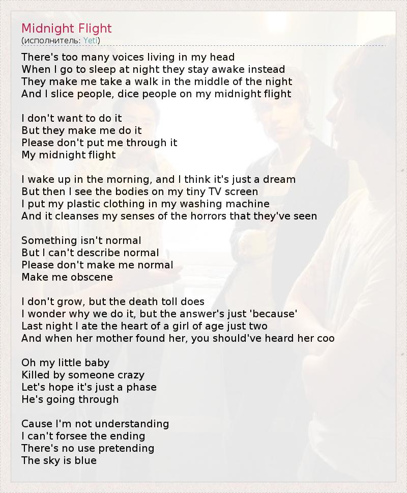Так много голосов живут в моей голове, Когда я иду спать ночью, они, наоборот, просыпаются. Они заставляют меня гулять посреди ночи, И я нарезаю людей ломтиками, кубиками в своем полуночном полете. Я не хочу делать этого, Но они заставляют меня. Пожалуйста, не заканчивайте Мой полуночный полет! Я просыпаюсь утром, и я думаю, что просто это сон, Но потом я вижу тела на моем маленьком экране телевизора. Я кладу свою полиэтиленовую одежду в свою стиральную машину, И она смывает мои чувства от ужасов, которые они видели. Что-то ненормально, Но я не могу описать нормально. Пожалуйста, не делайте меня нормальным, Сделайте меня непристойным. Я не расту, но число погибших - да, Мне интересно, зачем мы это делаем, но ответ лишь "потому что". Прошлой ночью я съел сердце двухлетней девочки, И когда ее мама нашла ее, ты наверняка слышал ее крики. "О, моя маленькая малышка Убита каким-то психом!" Будем надеяться, это временно, Что это пройдет... Потому, что я не понимаю, Я не могу предвидеть финал. Нет смысла притворяться - Небо голубое.
