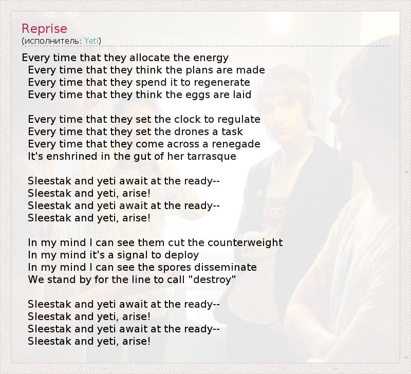 Every time that they allocate the energy Every time that they think the plans are made Every time that they spend it to regenerate Every time that they think the eggs are laid Every time that they set the clock to regulate Every time that they set the drones a task Every time that they come across a renegade It's enshrined in the gut of her tarrasque Sleestak and yeti await at the ready-- Sleestak and yeti, arise! Sleestak and yeti await at the ready-- Sleestak and yeti, arise! In my mind I can see them cut the counterweight In my mind it's a signal to deploy In my mind I can see the spores disseminate We stand by for the line to call "destroy" Sleestak and yeti await at the ready-- Sleestak and yeti, arise! Sleestak and yeti await at the ready-- Sleestak and yeti, arise!