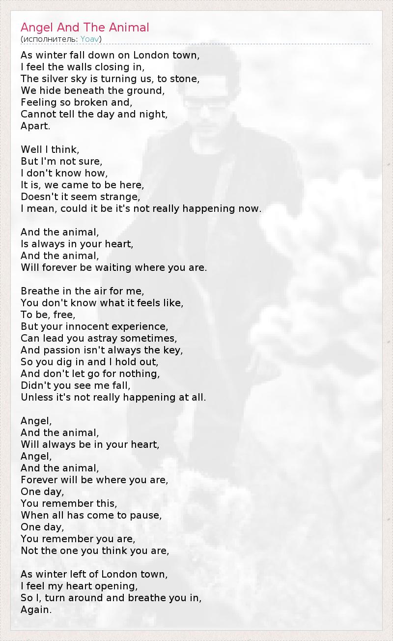 As winter fall down on London town, I feel the walls closing in, The silver sky is turning us, to stone, We hide beneath the ground, Feeling so broken and, Cannot tell the day and night, Apart. Well I think, But I'm not sure, I don't know how, It is, we came to be here, Doesn't it seem strange, I mean, could it be it's not really happening now. And the animal, Is always in your heart, And the animal, Will forever be waiting where you are. Breathe in the air for me, You don't know what it feels like, To be, free, But your innocent experience, Can lead you astray sometimes, And passion isn't always the key, So you dig in and I hold out, And don't let go for nothing, Didn't you see me fall, Unless it's not really happening at all. Angel, And the animal, Will always be in your heart, Angel, And the animal, Forever will be where you are, One day, You remember this, When all has come to pause, One day, You remember you are, Not the one you think you are, As winter left of London town, I feel my heart opening, So I, turn around and breathe you in, Again.