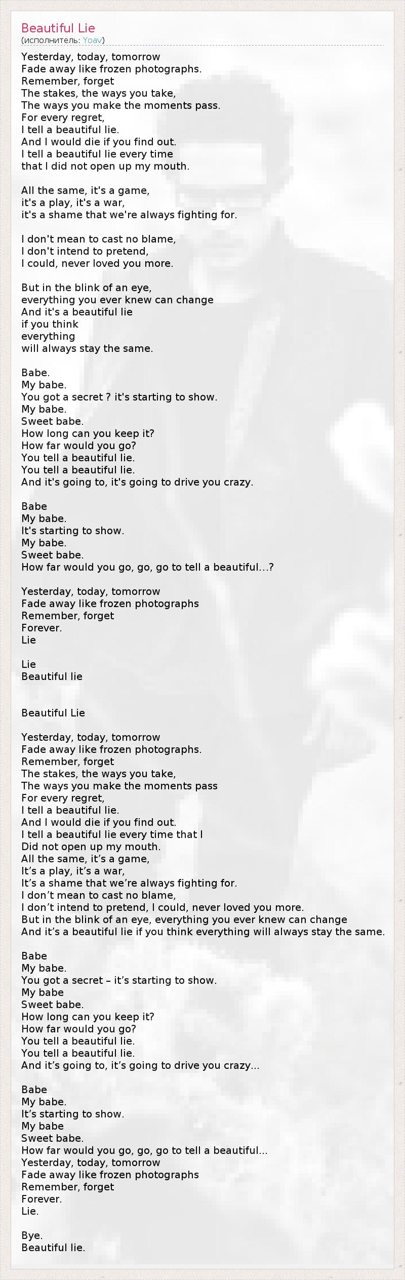 Yesterday, today, tomorrow Fade away like frozen photographs. Remember, forget The stakes, the ways you take, The ways you make the moments pass. For every regret, I tell a beautiful lie. And I would die if you find out. I tell a beautiful lie every time that I did not open up my mouth. All the same, it's a game, it's a play, it's a war, it's a shame that we're always fighting for. I don't mean to cast no blame, I don't intend to pretend, I could, never loved you more. But in the blink of an eye, everything you ever knew can change And it's a beautiful lie if you think everything will always stay the same. Babe. My babe. You got a secret ? it's starting to show. My babe. Sweet babe. How long can you keep it? How far would you go? You tell a beautiful lie. You tell a beautiful lie. And it's going to, it's going to drive you crazy. Babe My babe. It's starting to show. My babe. Sweet babe. How far would you go, go, go to tell a beautiful…? Yesterday, today, tomorrow Fade away like frozen photographs Remember, forget Forever. Lie Lie Beautiful lie Beautiful Lie Yesterday, today, tomorrow Fade away like frozen photographs. Remember, forget The stakes, the ways you take, The ways you make the moments pass For every regret, I tell a beautiful lie. And I would die if you find out. I tell a beautiful lie every time that I Did not open up my mouth. All the same, it’s a game, It’s a play, it’s a war, It’s a shame that we’re always fighting for. I don’t mean to cast no blame, I don’t intend to pretend, I could, never loved you more. But in the blink of an eye, everything you ever knew can change And it’s a beautiful lie if you think everything will always stay the same. Babe My babe. You got a secret – it’s starting to show. My babe Sweet babe. How long can you keep it? How far would you go? You tell a beautiful lie. You tell a beautiful lie. And it’s going to, it’s going to drive you crazy... Babe My babe. It’s starting to show. My babe Sweet babe. How far would you go, go, go to tell a beautiful... Yesterday, today, tomorrow Fade away like frozen photographs Remember, forget Forever. Lie. Bye. Beautiful lie.