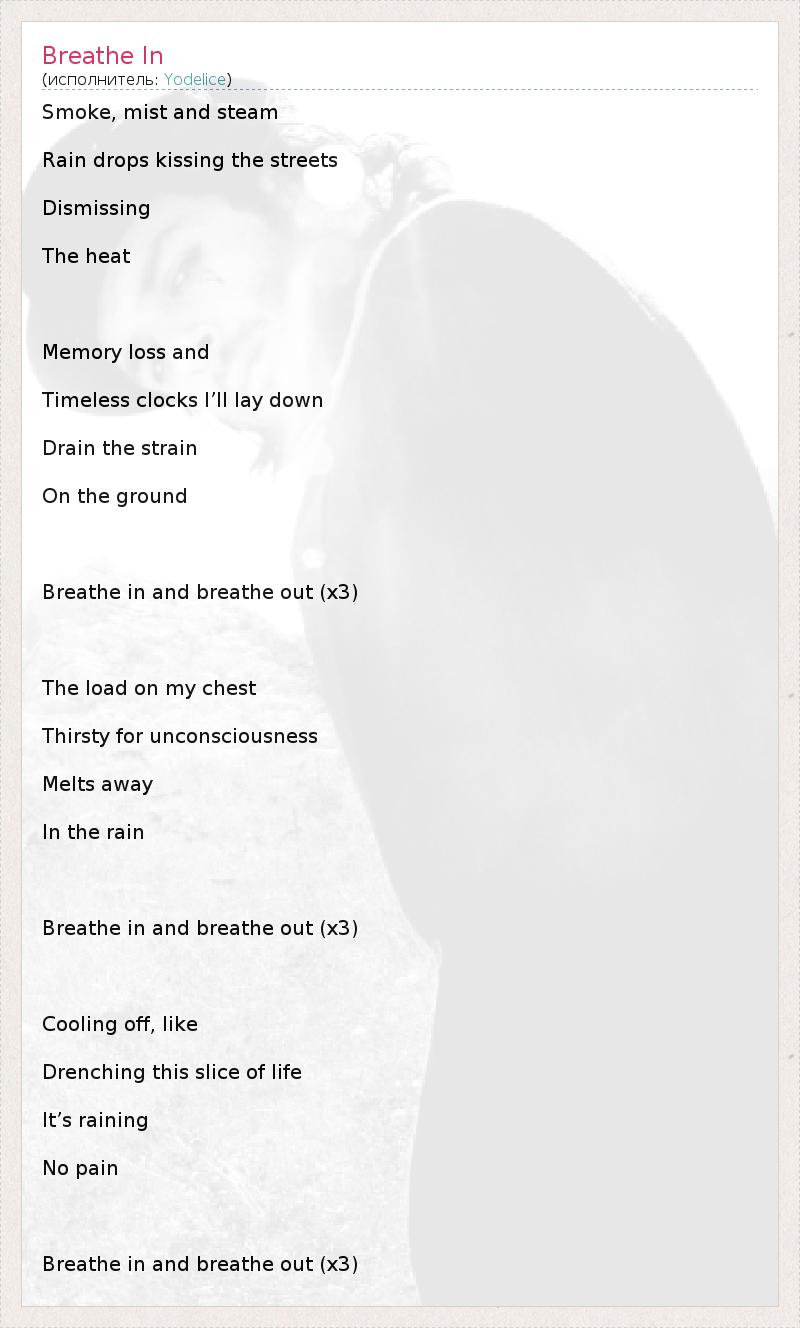 Smoke, mist and steam Rain drops kissing the streets Dismissing The heat Memory loss and Timeless clocks I’ll lay down Drain the strain On the ground Breathe in and breathe out (x3) The load on my chest Thirsty for unconsciousness Melts away In the rain Breathe in and breathe out (x3) Cooling off, like Drenching this slice of life It’s raining No pain Breathe in and breathe out (x3)