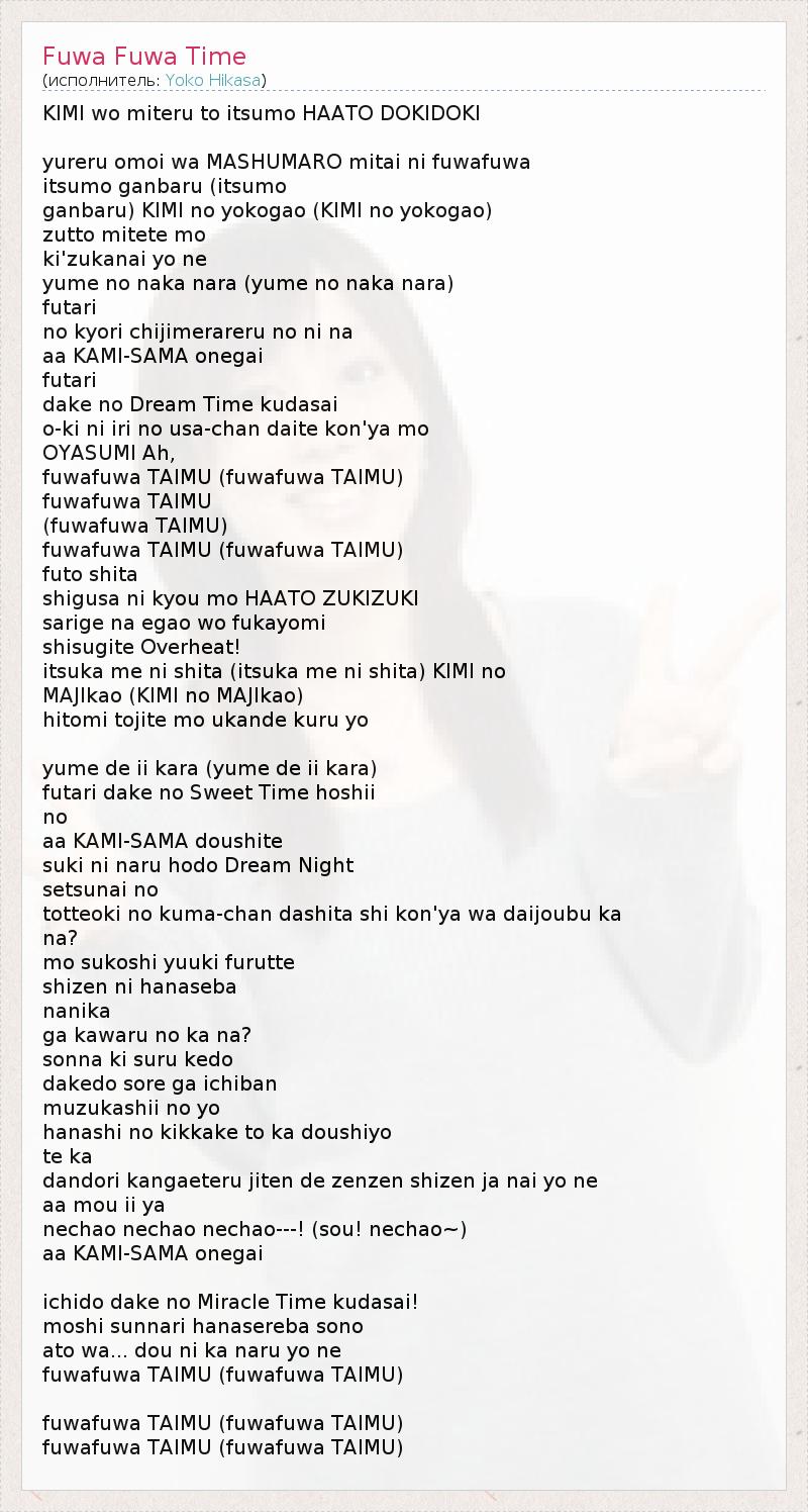 KIMI wo miteru to itsumo HAATO DOKIDOKI yureru omoi wa MASHUMARO mitai ni fuwafuwa itsumo ganbaru (itsumo ganbaru) KIMI no yokogao (KIMI no yokogao) zutto mitete mo ki'zukanai yo ne yume no naka nara (yume no naka nara) futari no kyori chijimerareru no ni na aa KAMI-SAMA onegai futari dake no Dream Time kudasai o-ki ni iri no usa-chan daite kon'ya mo OYASUMI Ah, fuwafuwa TAIMU (fuwafuwa TAIMU) fuwafuwa TAIMU (fuwafuwa TAIMU) fuwafuwa TAIMU (fuwafuwa TAIMU) futo shita shigusa ni kyou mo HAATO ZUKIZUKI sarige na egao wo fukayomi shisugite Overheat! itsuka me ni shita (itsuka me ni shita) KIMI no MAJIkao (KIMI no MAJIkao) hitomi tojite mo ukande kuru yo yume de ii kara (yume de ii kara) futari dake no Sweet Time hoshii no aa KAMI-SAMA doushite suki ni naru hodo Dream Night setsunai no totteoki no kuma-chan dashita shi kon'ya wa daijoubu ka na? mo sukoshi yuuki furutte shizen ni hanaseba nanika ga kawaru no ka na? sonna ki suru kedo dakedo sore ga ichiban muzukashii no yo hanashi no kikkake to ka doushiyo te ka dandori kangaeteru jiten de zenzen shizen ja nai yo ne aa mou ii ya nechao nechao nechao---! (sou! nechao~) aa KAMI-SAMA onegai ichido dake no Miracle Time kudasai! moshi sunnari hanasereba sono ato wa... dou ni ka naru yo ne fuwafuwa TAIMU (fuwafuwa TAIMU) fuwafuwa TAIMU (fuwafuwa TAIMU) fuwafuwa TAIMU (fuwafuwa TAIMU)