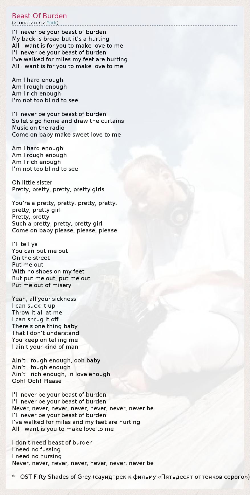I'll never be your beast of burden My back is broad but it's a hurting All I want is for you to make love to me I'll never be your beast of burden I've walked for miles my feet are hurting All I want is for you to make love to me Am I hard enough Am I rough enough Am I rich enough I'm not too blind to see I'll never be your beast of burden So let's go home and draw the curtains Music on the radio Come on baby make sweet love to me Am I hard enough Am I rough enough Am I rich enough I'm not too blind to see Oh little sister Pretty, pretty, pretty, pretty girls You're a pretty, pretty, pretty, pretty, pretty, pretty girl Pretty, pretty Such a pretty, pretty, pretty girl Come on baby please, please, please I'll tell ya You can put me out On the street Put me out With no shoes on my feet But put me out, put me out Put me out of misery Yeah, all your sickness I can suck it up Throw it all at me I can shrug it off There's one thing baby That I don't understand You keep on telling me I ain't your kind of man Ain't I rough enough, ooh baby Ain't I tough enough Ain't I rich enough, in love enough Ooh! Ooh! Please I'll never be your beast of burden I'll never be your beast of burden Never, never, never, never, never, never, never be I'll never be your beast of burden I've walked for miles and my feet are hurting All I want is you to make love to me I don't need beast of burden I need no fussing I need no nursing Never, never, never, never, never, never, never be * - OST Fifty Shades of Grey (cаундтрек к фильму «Пятьдесят оттенков серого»)