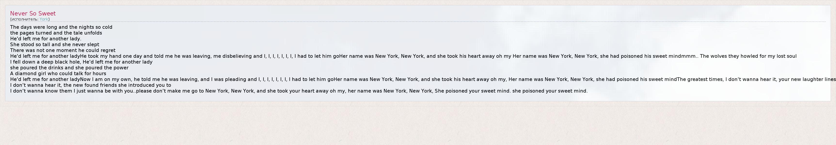 The days were long and the nights so cold the pages turned and the tale unfolds He'd left me for another lady. She stood so tall and she never slept There was not one moment he could regret He'd left me for another ladyHe took my hand one day and told me he was leaving, me disbelieving and I, I, I, I, I, I, I, I had to let him goHer name was New York, New York, and she took his heart away oh my Her name was New York, New York, she had poisoned his sweet mindmmm.. The wolves they howled for my lost soul I fell down a deep black hole, He'd left me for another lady she poured the drinks and she poured the power A diamond girl who could talk for hours He'd left me for another ladyNow I am on my own, he told me he was leaving, and I was pleading and I, I, I, I, I, I, I, I had to let him goHer name was New York, New York, and she took his heart away oh my, Her name was New York, New York, she had poisoned his sweet mindThe greatest times, I don't wanna hear it, your new laughter lines I don't wanna hear it, the new found friends she introduced you to I don't wanna know them I just wanna be with you..please don't make me go to New York, New York, and she took your heart away oh my, her name was New York, New York, She poisoned your sweet mind. she poisoned your sweet mind.
