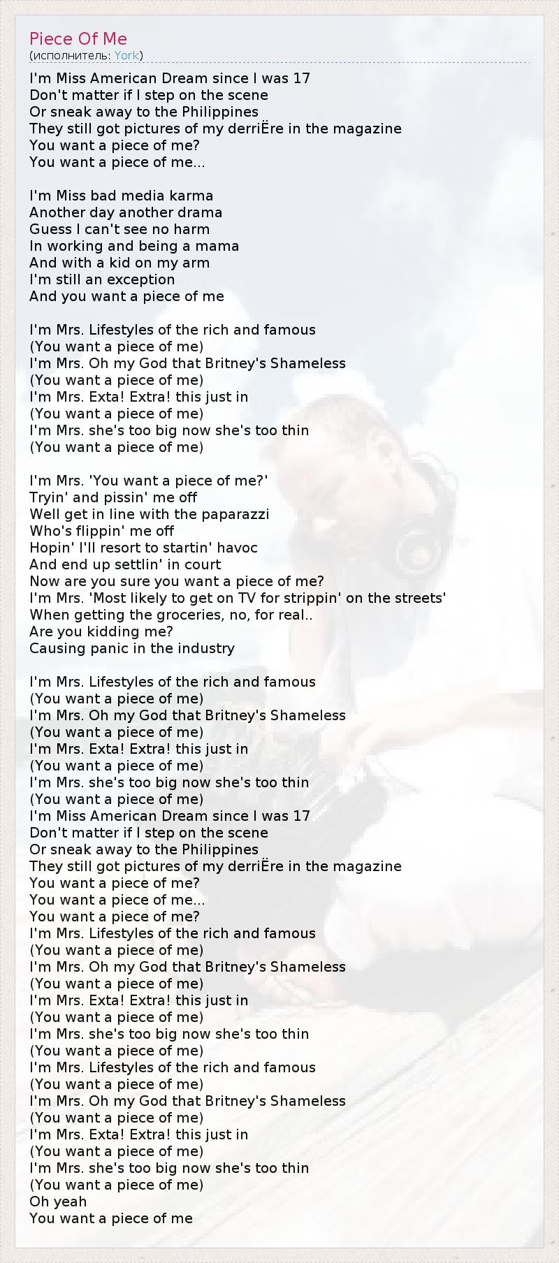I'm Miss American Dream since I was 17 Don't matter if I step on the scene Or sneak away to the Philippines They still got pictures of my derriЁre in the magazine You want a piece of me? You want a piece of me... I'm Miss bad media karma Another day another drama Guess I can't see no harm In working and being a mama And with a kid on my arm I'm still an exception And you want a piece of me I'm Mrs. Lifestyles of the rich and famous (You want a piece of me) I'm Mrs. Oh my God that Britney's Shameless (You want a piece of me) I'm Mrs. Exta! Extra! this just in (You want a piece of me) I'm Mrs. she's too big now she's too thin (You want a piece of me) I'm Mrs. 'You want a piece of me?' Tryin' and pissin' me off Well get in line with the paparazzi Who's flippin' me off Hopin' I'll resort to startin' havoc And end up settlin' in court Now are you sure you want a piece of me? I'm Mrs. 'Most likely to get on TV for strippin' on the streets' When getting the groceries, no, for real.. Are you kidding me? Causing panic in the industry I'm Mrs. Lifestyles of the rich and famous (You want a piece of me) I'm Mrs. Oh my God that Britney's Shameless (You want a piece of me) I'm Mrs. Exta! Extra! this just in (You want a piece of me) I'm Mrs. she's too big now she's too thin (You want a piece of me) I'm Miss American Dream since I was 17 Don't matter if I step on the scene Or sneak away to the Philippines They still got pictures of my derriЁre in the magazine You want a piece of me? You want a piece of me... You want a piece of me? I'm Mrs. Lifestyles of the rich and famous (You want a piece of me) I'm Mrs. Oh my God that Britney's Shameless (You want a piece of me) I'm Mrs. Exta! Extra! this just in (You want a piece of me) I'm Mrs. she's too big now she's too thin (You want a piece of me) I'm Mrs. Lifestyles of the rich and famous (You want a piece of me) I'm Mrs. Oh my God that Britney's Shameless (You want a piece of me) I'm Mrs. Exta! Extra! this just in (You want a piece of me) I'm Mrs. she's too big now she's too thin (You want a piece of me) Oh yeah You want a piece of me