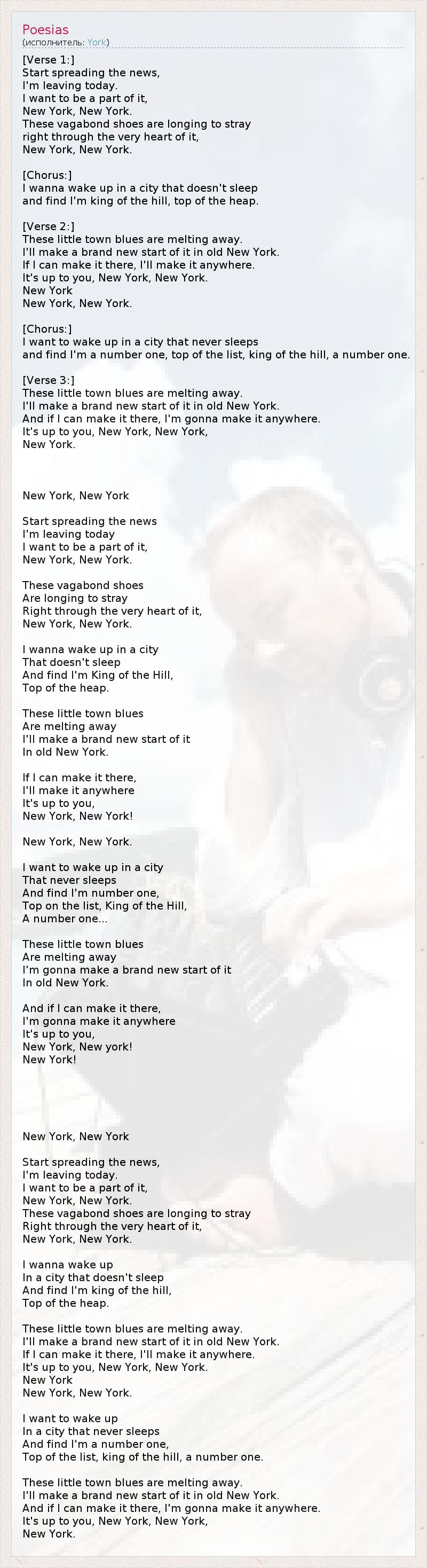 [1-ый куплет:] Сообщайте об этом всем, Я уезжаю сегодня. Я хочу быть частью него, Нью-Йорка, Нью-Йорка. Эти башмаки скучают без ходьбы Прямо через всё его самое сердце, Нью-Йорка, Нью-Йорка. [Припев:] Хочу проснуться в городе, который не спит И узнать, что я король горы, её вершина. [2-ой куплет:] Растаивает этот блюз малых городов. Я сделаю его совершенно новым в старом Нью-Йорке. Если я могу сделать его здесь, я сделаю это везде. Тебе решать тебе, Нью-Йорк, Нью-Йорк. Нью-Йорк, Нью-Йорк, Нью-Йорк. [Припев:] Хочу проснуться в городе, который не спит И узнать, что я - номер один, первый в списке, король горы, номер один. [3-ий куплет:] Растаивает этот блюз малых городов. Я сделаю его совершенно новым в старом Нью-Йорке. Если я могу сделать его здесь, я намерен сделать это везде. Тебе решать тебе, Нью-Йорк, Нью-Йорк. Нью-Йорк. Нью-Йорк, Нью-Йорк* (перевод Осипов Василий из Москвы) Сегодня умчусь, Покину друзей. Давно к себе меня манит Нью-Йорк, Нью-Йорк. Неброской обувкой Бродяжьей моей Хочу топтать его гранит, Нью-Йорк, Нью-Йорк. Хочу я видеть ночью синей, Что он не спит, А я поныне "царь горы", Никем не сбит. Нет, не возвращусь Я в свой городок. Позволь всё заново начать мне тут, Старик Нью-Йорк. И коль я выдюжу здесь, Так сумею везде, Решать тебе, Нью-Йорк, Нью-Йорк! Нью-Йорк, Нью-Йорк. Хочу я видеть ночью синей, Как он не спит, Знать что я номер один, Лучший из всех, княжич горы, Номер один... Нет, назад не вернусь Я в свой городок. Позволь всё заново начать мне тут, Нью-Йорк, Нью-Йорк. Эх, и уж коль я выдюжу здесь, Так сумею вездке. Решать тебе, Нью-Йорк, Нью-Йорк! Нью-Йорк! * поэтический (эквиримтический) перевод с элементами творческой интерпретации Нью-Йорк, Нью-Йорк (перевод Гудович Александр из Воронежа) Я уезжаю и всем Об этом говорю. Хочу быть там и только там. Нью-Йорк, Нью-Йорк И стоптанные башмаки, казалось, им не все равно. Так нет, ведут они меня туда. Нью-Йорк, Нью-Йорк. Хочу проснуться завтра там, Где свет ночных огней не говорит о сне. Хочу быть первым в списке я, Хочу быть королем холма. И банджо звук все тише слышу я. Назад отрезан путь, А впереди манит меня Твой силуэт в закате дня, Нью-Йорк, Нью-Йорк Нью-Йорк, Нью-Йорк, Нью-Йорк. Хочу проснуться завтра там, Где свет ночных огней не говорит о сне. Хочу быть первым в списке я, Хочу быть королем холма. И если буду первым там, То буду первым я везде. Я встречи жду с тобой, Нью-Йорк Нью-Йорк, не обмани меня Нью-Йорк.