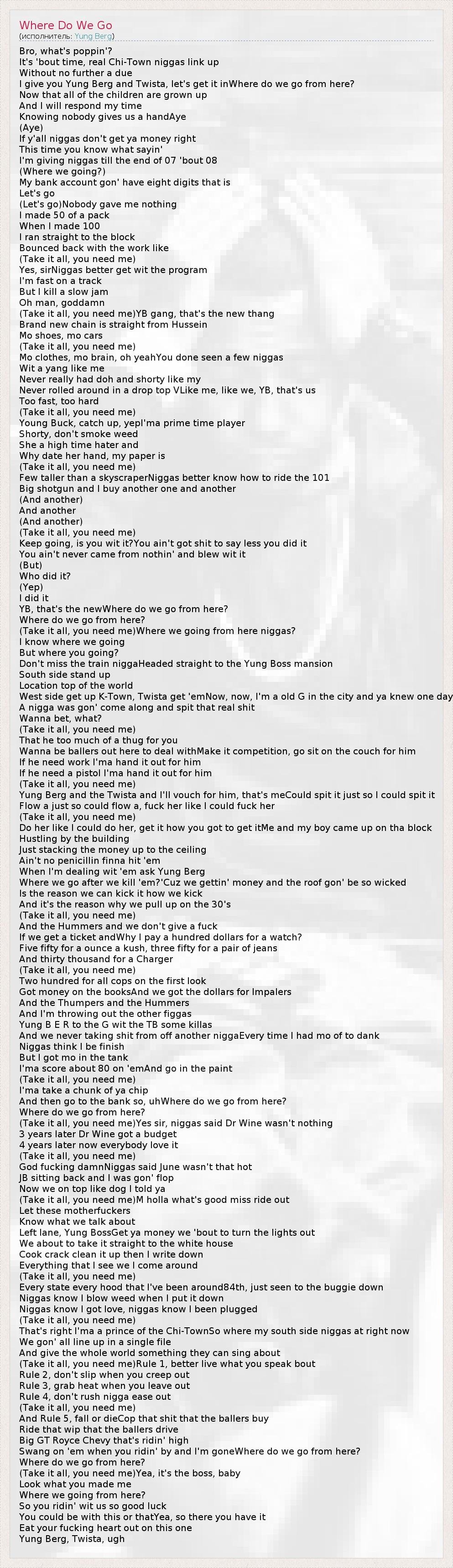 Bro, what's poppin'? It's 'bout time, real Chi-Town niggas link up Without no further a due I give you Yung Berg and Twista, let's get it inWhere do we go from here? Now that all of the children are grown up And I will respond my time Knowing nobody gives us a handAye (Aye) If y'all niggas don't get ya money right This time you know what sayin' I'm giving niggas till the end of 07 'bout 08 (Where we going?) My bank account gon' have eight digits that is Let's go (Let's go)Nobody gave me nothing I made 50 of a pack When I made 100 I ran straight to the block Bounced back with the work like (Take it all, you need me) Yes, sirNiggas better get wit the program I'm fast on a track But I kill a slow jam Oh man, goddamn (Take it all, you need me)YB gang, that's the new thang Brand new chain is straight from Hussein Mo shoes, mo cars (Take it all, you need me) Mo clothes, mo brain, oh yeahYou done seen a few niggas Wit a yang like me Never really had doh and shorty like my Never rolled around in a drop top VLike me, like we, YB, that's us Too fast, too hard (Take it all, you need me) Young Buck, catch up, yepI'ma prime time player Shorty, don't smoke weed She a high time hater and Why date her hand, my paper is (Take it all, you need me) Few taller than a skyscraperNiggas better know how to ride the 101 Big shotgun and I buy another one and another (And another) And another (And another) (Take it all, you need me) Keep going, is you wit it?You ain't got shit to say less you did it You ain't never came from nothin' and blew wit it (But) Who did it? (Yep) I did it YB, that's the newWhere do we go from here? Where do we go from here? (Take it all, you need me)Where we going from here niggas? I know where we going But where you going? Don't miss the train niggaHeaded straight to the Yung Boss mansion South side stand up Location top of the world West side get up K-Town, Twista get 'emNow, now, I'm a old G in the city and ya knew one day A nigga was gon' come along and spit that real shit Wanna bet, what? (Take it all, you need me) That he too much of a thug for you Wanna be ballers out here to deal withMake it competition, go sit on the couch for him If he need work I'ma hand it out for him If he need a pistol I'ma hand it out for him (Take it all, you need me) Yung Berg and the Twista and I'll vouch for him, that's meCould spit it just so I could spit it Flow a just so could flow a, fuck her like I could fuck her (Take it all, you need me) Do her like I could do her, get it how you got to get itMe and my boy came up on tha block Hustling by the building Just stacking the money up to the ceiling Ain't no penicillin finna hit 'em When I'm dealing wit 'em ask Yung Berg Where we go after we kill 'em?'Cuz we gettin' money and the roof gon' be so wicked Is the reason we can kick it how we kick And it's the reason why we pull up on the 30's (Take it all, you need me) And the Hummers and we don't give a fuck If we get a ticket andWhy I pay a hundred dollars for a watch? Five fifty for a ounce a kush, three fifty for a pair of jeans And thirty thousand for a Charger (Take it all, you need me) Two hundred for all cops on the first look Got money on the booksAnd we got the dollars for Impalers And the Thumpers and the Hummers And I'm throwing out the other figgas Yung B E R to the G wit the TB some killas And we never taking shit from off another niggaEvery time I had mo of to dank Niggas think I be finish But I got mo in the tank I'ma score about 80 on 'emAnd go in the paint (Take it all, you need me) I'ma take a chunk of ya chip And then go to the bank so, uhWhere do we go from here? Where do we go from here? (Take it all, you need me)Yes sir, niggas said Dr Wine wasn't nothing 3 years later Dr Wine got a budget 4 years later now everybody love it (Take it all, you need me) God fucking damnNiggas said June wasn't that hot JB sitting back and I was gon' flop Now we on top like dog I told ya (Take it all, you need me)M holla what's good miss ride out Let these motherfuckers Know what we talk about Left lane, Yung BossGet ya money we 'bout to turn the lights out We about to take it straight to the white house Cook crack clean it up then I write down Everything that I see we I come around (Take it all, you need me) Every state every hood that I've been around84th, just seen to the buggie down Niggas know I blow weed when I put it down Niggas know I got love, niggas know I been plugged (Take it all, you need me) That's right I'ma a prince of the Chi-TownSo where my south side niggas at right now We gon' all line up in a single file And give the whole world something they can sing about (Take it all, you need me)Rule 1, better live what you speak bout Rule 2, don't slip when you creep out Rule 3, grab heat when you leave out Rule 4, don't rush nigga ease out (Take it all, you need me) And Rule 5, fall or dieCop that shit that the ballers buy Ride that wip that the ballers drive Big GT Royce Chevy that's ridin' high Swang on 'em when you ridin' by and I'm goneWhere do we go from here? Where do we go from here? (Take it all, you need me)Yea, it's the boss, baby Look what you made me Where we going from here? So you ridin' wit us so good luck You could be with this or thatYea, so there you have it Eat your fucking heart out on this one Yung Berg, Twista, ugh