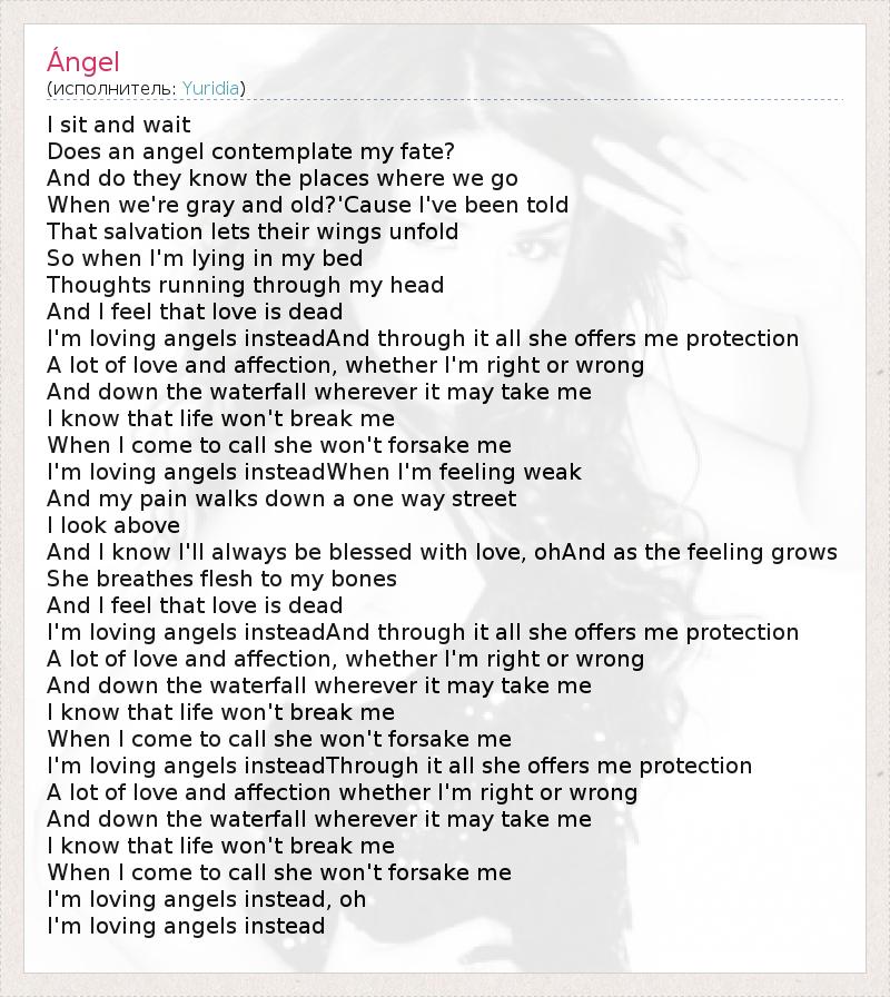I sit and wait Does an angel contemplate my fate? And do they know the places where we go When we're gray and old?'Cause I've been told That salvation lets their wings unfold So when I'm lying in my bed Thoughts running through my head And I feel that love is dead I'm loving angels insteadAnd through it all she offers me protection A lot of love and affection, whether I'm right or wrong And down the waterfall wherever it may take me I know that life won't break me When I come to call she won't forsake me I'm loving angels insteadWhen I'm feeling weak And my pain walks down a one way street I look above And I know I'll always be blessed with love, ohAnd as the feeling grows She breathes flesh to my bones And I feel that love is dead I'm loving angels insteadAnd through it all she offers me protection A lot of love and affection, whether I'm right or wrong And down the waterfall wherever it may take me I know that life won't break me When I come to call she won't forsake me I'm loving angels insteadThrough it all she offers me protection A lot of love and affection whether I'm right or wrong And down the waterfall wherever it may take me I know that life won't break me When I come to call she won't forsake me I'm loving angels instead, oh I'm loving angels instead