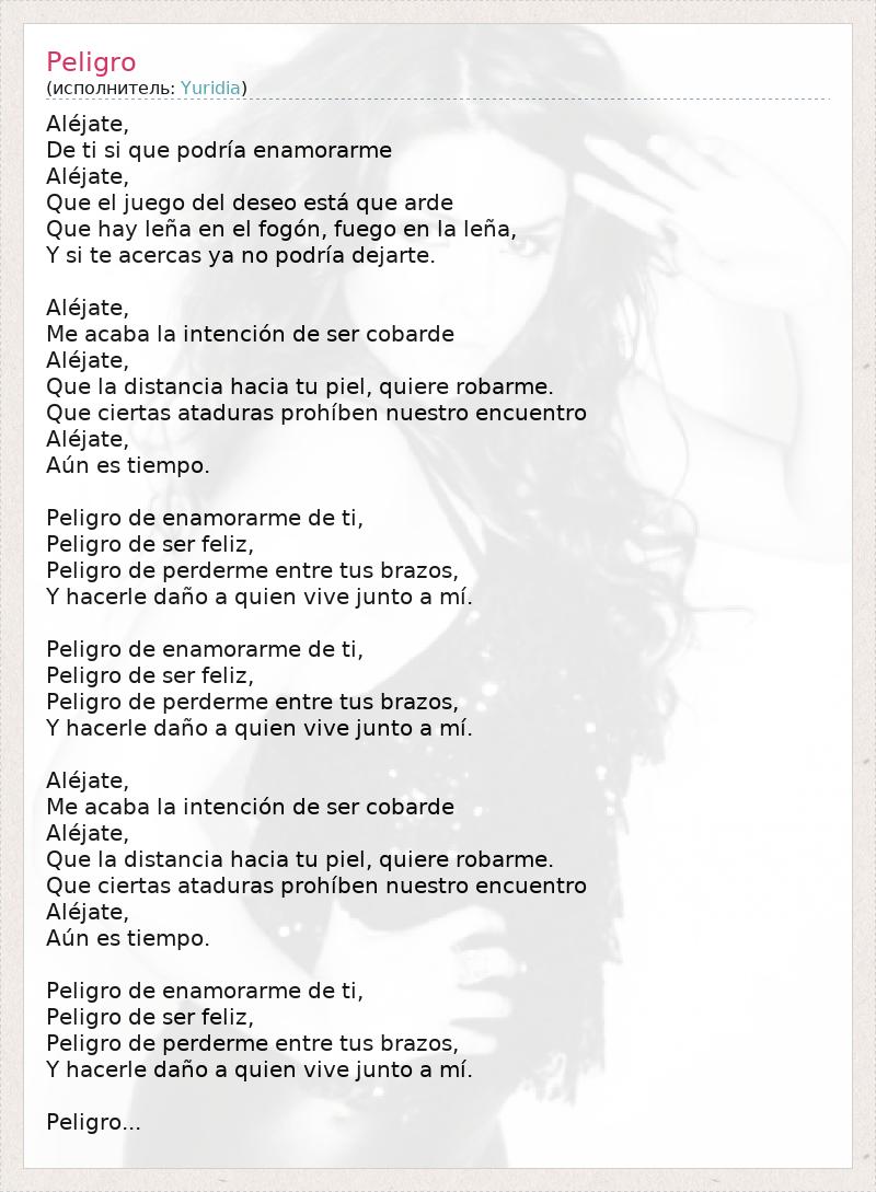 Aléjate, Де ти си Que podría enamorarme Aléjate, Que эль Juego дель Deseo está Que Арди Que сено-Лена ан-эль-Fogón, Fuego En La Лена, У си те acercas я не podría dejarte. Aléjate, Я Акаба ла intención де сер cobarde Aléjate, Que ла Distancia HACIA ту Piel, quiere robarme. Que ciertas ataduras prohíben Nuestro Encuentro Aléjate, Аун эс Tiempo. Peligro де enamorarme де ти, Peligro де сер Фелис, Peligro де perderme Entre ЕП Brazos, У hacerle Дано A quién Vive клика Ми. Peligro де enamorarme де ти, Peligro де сер Фелис, Peligro де perderme Entre ЕП Brazos, У hacerle Дано A quién Vive клика Ми. Aléjate, Я Акаба ла intención де сер cobarde Aléjate, Que ла Distancia HACIA ту Piel, quiere robarme. Que ciertas ataduras prohíben Nuestro Encuentro Aléjate, Аун эс Tiempo. Peligro де enamorarme де ти, Peligro де сер Фелис, Peligro де perderme Entre ЕП Brazos, У hacerle Дано A quién Vive клика Ми. Peligro ...