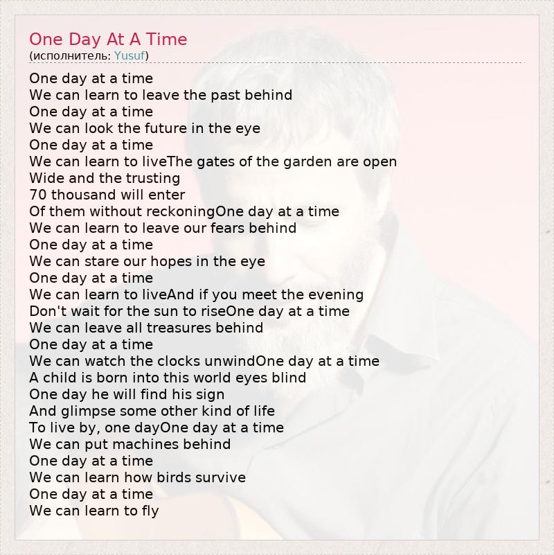 One day at a time We can learn to leave the past behind One day at a time We can look the future in the eye One day at a time We can learn to liveThe gates of the garden are open Wide and the trusting 70 thousand will enter Of them without reckoningOne day at a time We can learn to leave our fears behind One day at a time We can stare our hopes in the eye One day at a time We can learn to liveAnd if you meet the evening Don't wait for the sun to riseOne day at a time We can leave all treasures behind One day at a time We can watch the clocks unwindOne day at a time A child is born into this world eyes blind One day he will find his sign And glimpse some other kind of life To live by, one dayOne day at a time We can put machines behind One day at a time We can learn how birds survive One day at a time We can learn to fly