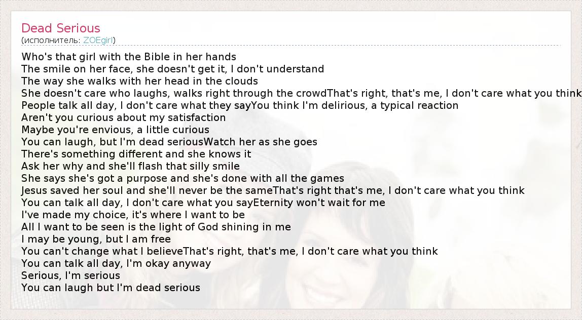 Who's that girl with the Bible in her hands The smile on her face, she doesn't get it, I don't understand The way she walks with her head in the clouds She doesn't care who laughs, walks right through the crowdThat's right, that's me, I don't care what you think People talk all day, I don't care what they sayYou think I'm delirious, a typical reaction Aren't you curious about my satisfaction Maybe you're envious, a little curious You can laugh, but I'm dead seriousWatch her as she goes There's something different and she knows it Ask her why and she'll flash that silly smile She says she's got a purpose and she's done with all the games Jesus saved her soul and she'll never be the sameThat's right that's me, I don't care what you think You can talk all day, I don't care what you sayEternity won't wait for me I've made my choice, it's where I want to be All I want to be seen is the light of God shining in me I may be young, but I am free You can't change what I believeThat's right, that's me, I don't care what you think You can talk all day, I'm okay anyway Serious, I'm serious You can laugh but I'm dead serious