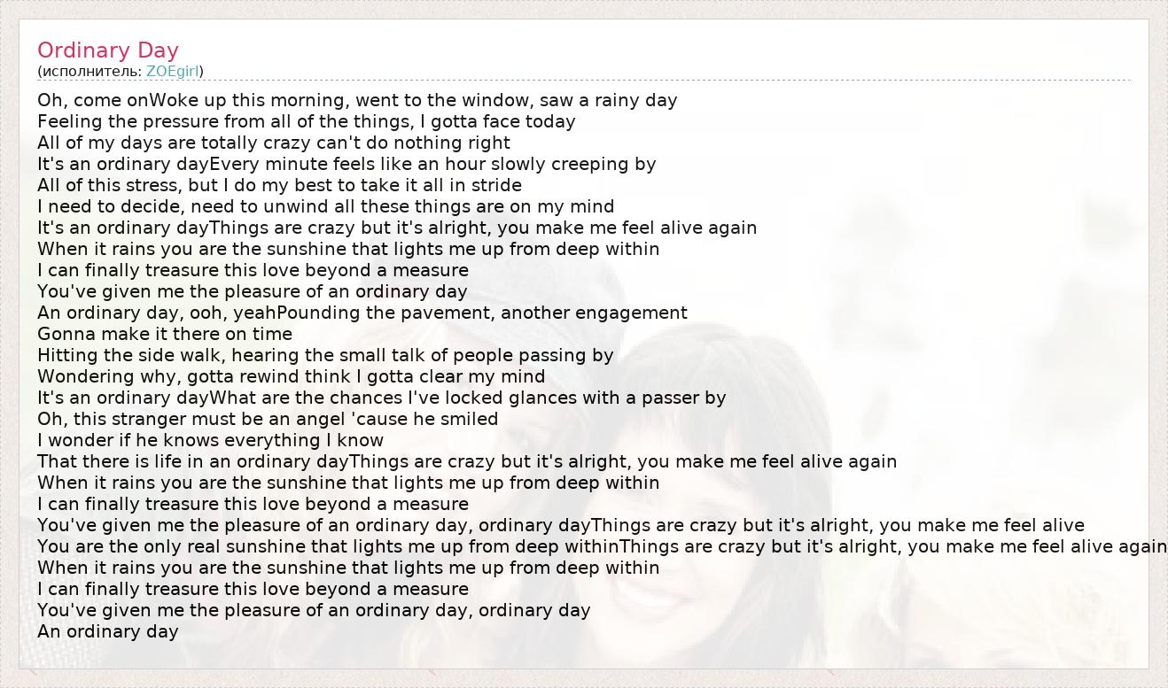 Oh, come onWoke up this morning, went to the window, saw a rainy day Feeling the pressure from all of the things, I gotta face today All of my days are totally crazy can't do nothing right It's an ordinary dayEvery minute feels like an hour slowly creeping by All of this stress, but I do my best to take it all in stride I need to decide, need to unwind all these things are on my mind It's an ordinary dayThings are crazy but it's alright, you make me feel alive again When it rains you are the sunshine that lights me up from deep within I can finally treasure this love beyond a measure You've given me the pleasure of an ordinary day An ordinary day, ooh, yeahPounding the pavement, another engagement Gonna make it there on time Hitting the side walk, hearing the small talk of people passing by Wondering why, gotta rewind think I gotta clear my mind It's an ordinary dayWhat are the chances I've locked glances with a passer by Oh, this stranger must be an angel 'cause he smiled I wonder if he knows everything I know That there is life in an ordinary dayThings are crazy but it's alright, you make me feel alive again When it rains you are the sunshine that lights me up from deep within I can finally treasure this love beyond a measure You've given me the pleasure of an ordinary day, ordinary dayThings are crazy but it's alright, you make me feel alive You are the only real sunshine that lights me up from deep withinThings are crazy but it's alright, you make me feel alive again When it rains you are the sunshine that lights me up from deep within I can finally treasure this love beyond a measure You've given me the pleasure of an ordinary day, ordinary day An ordinary day