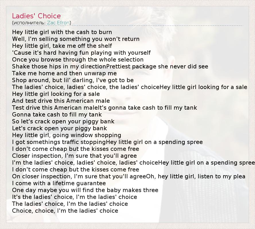 Hey little girl with the cash to burn Well, I'm selling something you won't return Hey little girl, take me off the shelf 'Cause it's hard having fun playing with yourself Once you browse through the whole selection Shake those hips in my directionPrettiest package she never did see Take me home and then unwrap me Shop around, but lil' darling, I've got to be The ladies' choice, ladies' choice, the ladies' choiceHey little girl looking for a sale Hey little girl looking for a sale And test drive this American male Test drive this American maleIt's gonna take cash to fill my tank Gonna take cash to fill my tank So let's crack open your piggy bank Let's crack open your piggy bank Hey little girl, going window shopping I got somethings traffic stoppingHey little girl on a spending spree I don't come cheap but the kisses come free Closer inspection, I'm sure that you'll agree I'm the ladies' choice, ladies' choice, ladies' choiceHey little girl on a spending spree I don't come cheap but the kisses come free On closer inspection, I'm sure that you'll agreeOh, hey little girl, listen to my plea I come with a lifetime guarantee One day maybe you will find the baby makes three It's the ladies' choice, I'm the ladies' choice The ladies' choice, I'm the ladies' choice Choice, choice, I'm the ladies' choice