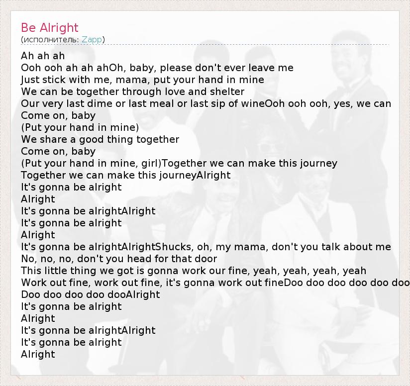 Ah ah ah Ooh ooh ah ah ahOh, baby, please don't ever leave me Just stick with me, mama, put your hand in mine We can be together through love and shelter Our very last dime or last meal or last sip of wineOoh ooh ooh, yes, we can Come on, baby (Put your hand in mine) We share a good thing together Come on, baby (Put your hand in mine, girl)Together we can make this journey Together we can make this journeyAlright It's gonna be alright Alright It's gonna be alrightAlright It's gonna be alright Alright It's gonna be alrightAlrightShucks, oh, my mama, don't you talk about me No, no, no, don't you head for that door This little thing we got is gonna work our fine, yeah, yeah, yeah, yeah Work out fine, work out fine, it's gonna work out fineDoo doo doo doo doo doo Doo doo doo doo dooAlright It's gonna be alright Alright It's gonna be alrightAlright It's gonna be alright Alright