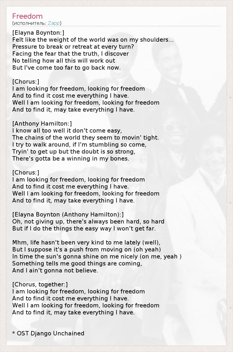[Elayna Boynton:] Felt like the weight of the world was on my shoulders... Pressure to break or retreat at every turn? Facing the fear that the truth, I discover No telling how all this will work out But I've come too far to go back now. [Chorus:] I am looking for freedom, looking for freedom And to find it cost me everything I have. Well I am looking for freedom, looking for freedom And to find it, may take everything I have. [Anthony Hamilton:] I know all too well it don't come easy, The chains of the world they seem to movin' tight. I try to walk around, if I'm stumbling so come, Tryin' to get up but the doubt is so strong, There's gotta be a winning in my bones. [Chorus:] I am looking for freedom, looking for freedom And to find it cost me everything I have. Well I am looking for freedom, looking for freedom And to find it, may take everything I have. [Elayna Boynton (Anthony Hamilton):] Oh, not giving up, there's always been hard, so hard But if I do the things the easy way I won't get far. Mhm, life hasn't been very kind to me lately (well), But I suppose it's a push from moving on (oh yeah) In time the sun's gonna shine on me nicely (on me, yeah ) Something tells me good things are coming, And I ain't gonna not believe. [Chorus, together:] I am looking for freedom, looking for freedom And to find it cost me everything I have. Well I am looking for freedom, looking for freedom And to find it, may take everything I have. * OST Django Unchained
