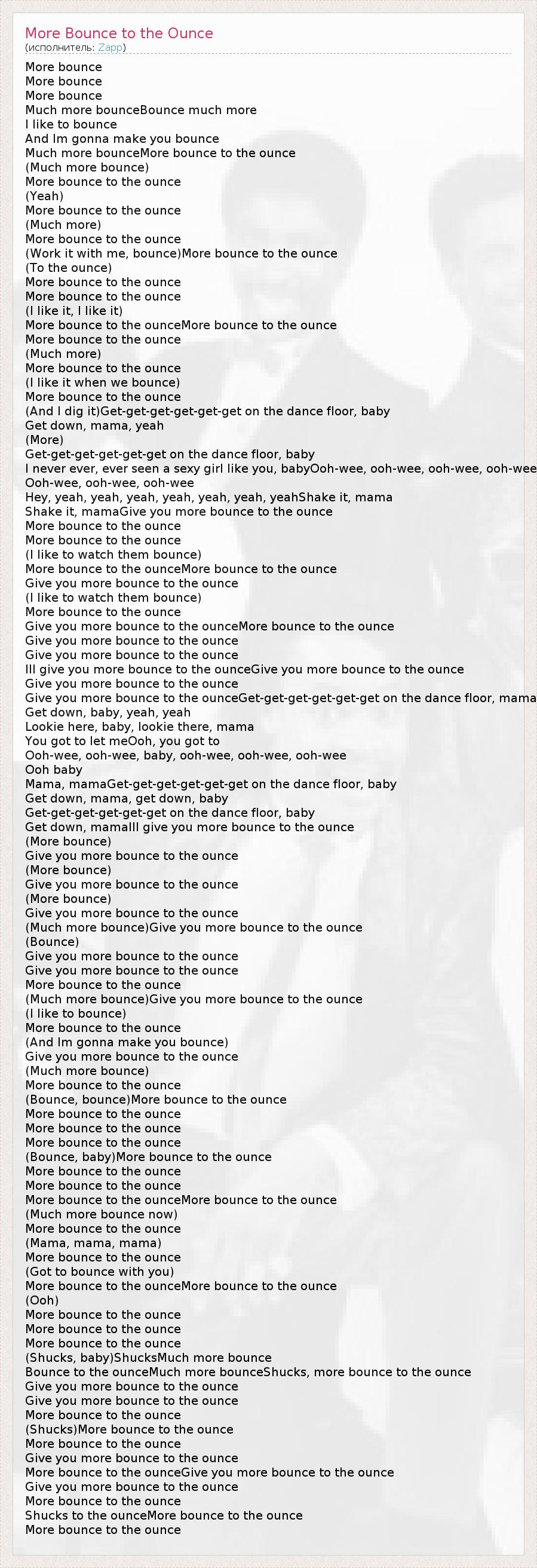 More bounce More bounce More bounce Much more bounceBounce much more I like to bounce And Im gonna make you bounce Much more bounceMore bounce to the ounce (Much more bounce) More bounce to the ounce (Yeah) More bounce to the ounce (Much more) More bounce to the ounce (Work it with me, bounce)More bounce to the ounce (To the ounce) More bounce to the ounce More bounce to the ounce (I like it, I like it) More bounce to the ounceMore bounce to the ounce More bounce to the ounce (Much more) More bounce to the ounce (I like it when we bounce) More bounce to the ounce (And I dig it)Get-get-get-get-get-get on the dance floor, baby Get down, mama, yeah (More) Get-get-get-get-get-get on the dance floor, baby I never ever, ever seen a sexy girl like you, babyOoh-wee, ooh-wee, ooh-wee, ooh-wee Ooh-wee, ooh-wee, ooh-wee Hey, yeah, yeah, yeah, yeah, yeah, yeah, yeahShake it, mama Shake it, mamaGive you more bounce to the ounce More bounce to the ounce More bounce to the ounce (I like to watch them bounce) More bounce to the ounceMore bounce to the ounce Give you more bounce to the ounce (I like to watch them bounce) More bounce to the ounce Give you more bounce to the ounceMore bounce to the ounce Give you more bounce to the ounce Give you more bounce to the ounce Ill give you more bounce to the ounceGive you more bounce to the ounce Give you more bounce to the ounce Give you more bounce to the ounceGet-get-get-get-get-get on the dance floor, mama Get down, baby, yeah, yeah Lookie here, baby, lookie there, mama You got to let meOoh, you got to Ooh-wee, ooh-wee, baby, ooh-wee, ooh-wee, ooh-wee Ooh baby Mama, mamaGet-get-get-get-get-get on the dance floor, baby Get down, mama, get down, baby Get-get-get-get-get-get on the dance floor, baby Get down, mamaIll give you more bounce to the ounce (More bounce) Give you more bounce to the ounce (More bounce) Give you more bounce to the ounce (More bounce) Give you more bounce to the ounce (Much more bounce)Give you more bounce to the ounce (Bounce) Give you more bounce to the ounce Give you more bounce to the ounce More bounce to the ounce (Much more bounce)Give you more bounce to the ounce (I like to bounce) More bounce to the ounce (And Im gonna make you bounce) Give you more bounce to the ounce (Much more bounce) More bounce to the ounce (Bounce, bounce)More bounce to the ounce More bounce to the ounce More bounce to the ounce More bounce to the ounce (Bounce, baby)More bounce to the ounce More bounce to the ounce More bounce to the ounce More bounce to the ounceMore bounce to the ounce (Much more bounce now) More bounce to the ounce (Mama, mama, mama) More bounce to the ounce (Got to bounce with you) More bounce to the ounceMore bounce to the ounce (Ooh) More bounce to the ounce More bounce to the ounce More bounce to the ounce (Shucks, baby)ShucksMuch more bounce Bounce to the ounceMuch more bounceShucks, more bounce to the ounce Give you more bounce to the ounce Give you more bounce to the ounce More bounce to the ounce (Shucks)More bounce to the ounce More bounce to the ounce Give you more bounce to the ounce More bounce to the ounceGive you more bounce to the ounce Give you more bounce to the ounce More bounce to the ounce Shucks to the ounceMore bounce to the ounce More bounce to the ounce