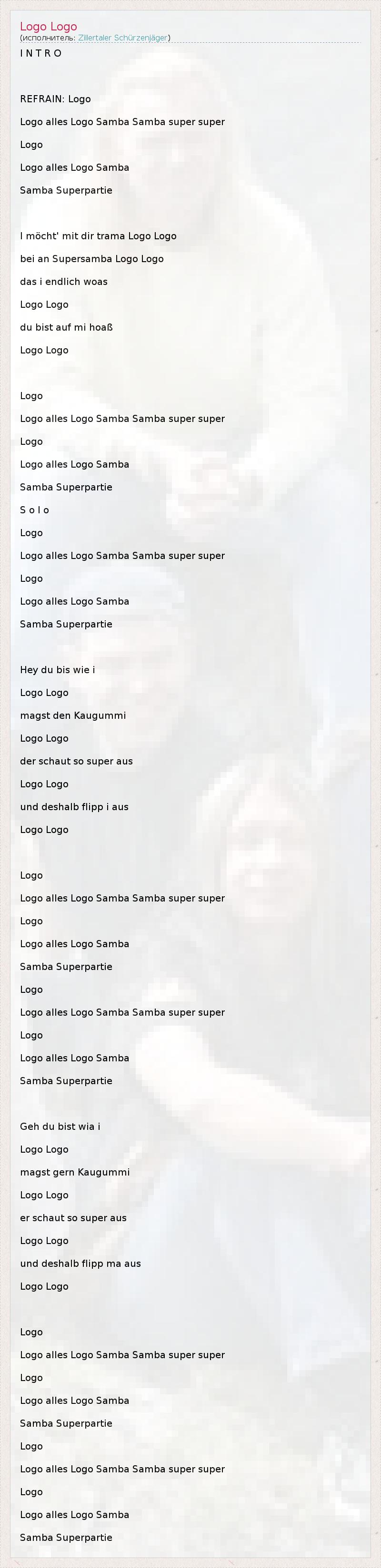 I N T R O REFRAIN: Logo Logo alles Logo Samba Samba super super Logo Logo alles Logo Samba Samba Superpartie I möcht' mit dir trama Logo Logo bei an Supersamba Logo Logo das i endlich woas Logo Logo du bist auf mi hoaß Logo Logo Logo Logo alles Logo Samba Samba super super Logo Logo alles Logo Samba Samba Superpartie S o l o Logo Logo alles Logo Samba Samba super super Logo Logo alles Logo Samba Samba Superpartie Hey du bis wie i Logo Logo magst den Kaugummi Logo Logo der schaut so super aus Logo Logo und deshalb flipp i aus Logo Logo Logo Logo alles Logo Samba Samba super super Logo Logo alles Logo Samba Samba Superpartie Logo Logo alles Logo Samba Samba super super Logo Logo alles Logo Samba Samba Superpartie Geh du bist wia i Logo Logo magst gern Kaugummi Logo Logo er schaut so super aus Logo Logo und deshalb flipp ma aus Logo Logo Logo Logo alles Logo Samba Samba super super Logo Logo alles Logo Samba Samba Superpartie Logo Logo alles Logo Samba Samba super super Logo Logo alles Logo Samba Samba Superpartie
