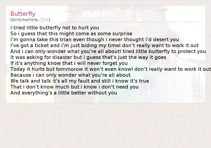 I tried little butterfly not to hurt you So i guess that this might come as some surprise I'm gonna take this trian even though i never thought i'd desert you I've got a ticket and i'm just biding my timeI don't really want to work it out And i can only wonder what you're all aboutI tired little butterfly to protect you It was asking for disaster but i guess that's just the way it goes If it's anything know that i will never forget you Today it hurts but tommorow it won't even knowI don't really want to work it out Because i can only wonder what you're all about We talk and talk it's all my fault and still i know it's true That i don't know much but i know i don't need you And everything's a little better without you