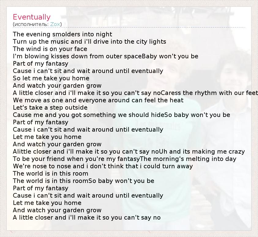 The evening smolders into night Turn up the music and i'll drive into the city lights The wind is on your face I'm blowing kisses down from outer spaceBaby won't you be Part of my fantasy Cause i can't sit and wait around until eventually So let me take you home And watch your garden grow A little closer and i'll make it so you can't say noCaress the rhythm with our feet We move as one and everyone around can feel the heat Let's take a step outside Cause me and you got something we should hideSo baby won't you be Part of my fantasy Cause i can't sit and wait around until eventually Let me take you home And watch your garden grow Alittle closer and i'll make it so you can't say noUh and its making me crazy To be your friend when you're my fantasyThe morning's melting into day We're nose to nose and i don't think that i could turn away The world is in this room The world is in this roomSo baby won't you be Part of my fantasy Cause i can't sit and wait around until eventually Let me take you home And watch your garden grow A little closer and i'll make it so you can't say no